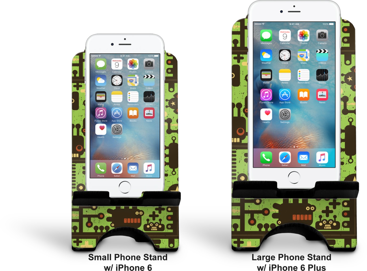 To meet your needs, we offer four variations of this IPhone stand. The backboard of the first version is shaped as a plain, yet sleek rectangle, and is available in two sizes. Our smaller size is approximately 4 by 3.25 by 7 inches, while the larger model is 4 by 3.77 by 8.5 inches. Alongside this model, we also provide you with a more decorative option. The upper part of our second version features a curved edge, for a classy, suave appearance. This phone holder is also sold in two sizes: a smaller version, which is 4 by 3.25 by 7 inches, and our larger model, which is 4 by 3.77 by 8.5 inches. Both models will support large phones, but the larger model is better if you wish to proudly display your personalized design.