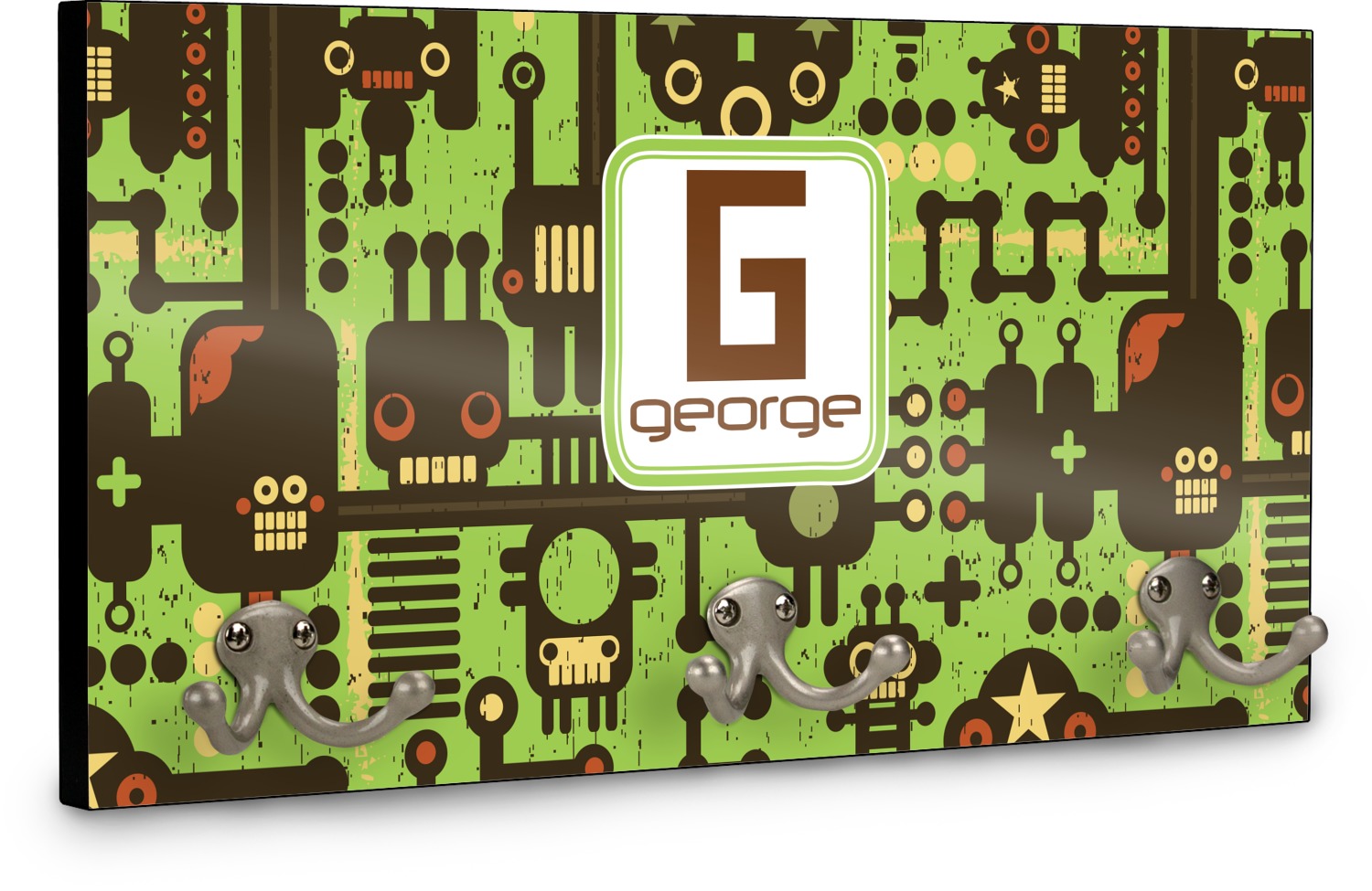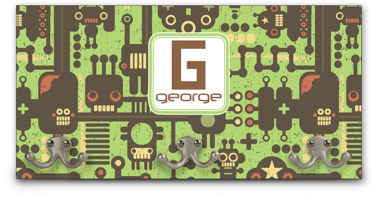 This coat rack is the perfect way to add some personality to your wall or entryway. The board is made of a strong maple that is approximately 16" x 8". The three 2-prong hooks are a sturdy metal that have three screws attaching them to the board. Your design is printed right onto the front of the board while the back and sides are a simple black.