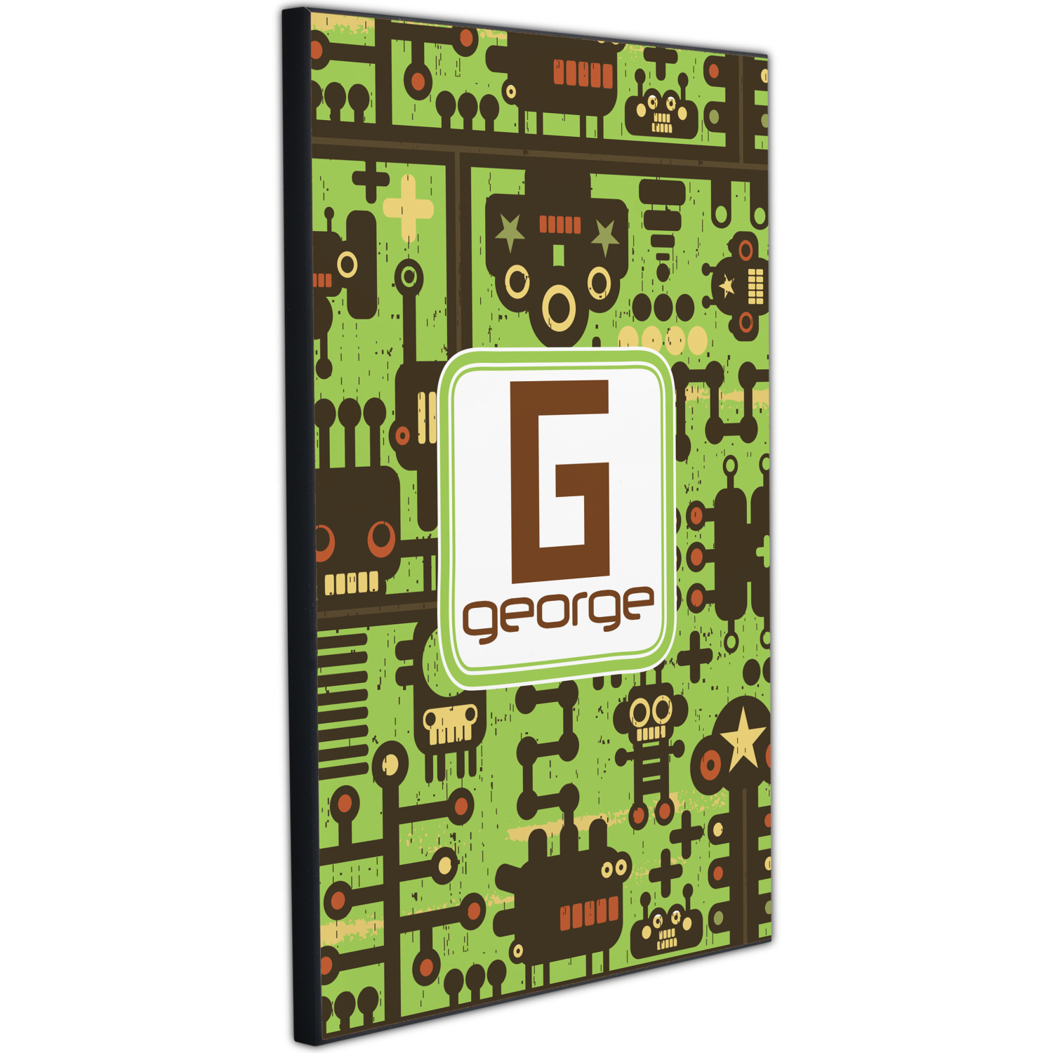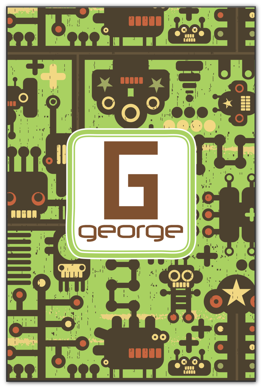 These retro robots will delight your little one and might even inspire their imagination! Brown robots of various sizes and shapes are set on a bright, lime-green background, with cool pipes and wiring adding to the whimsy.