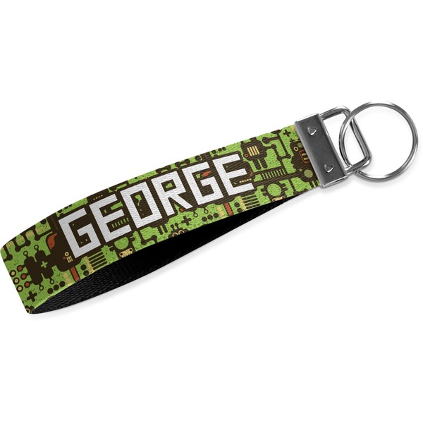 These key fob keychains are made from a polyester weave, right here in the USA. They feature a silver, metal clasp, attached to a round keyring. The piece gives the personalized wristlet a beautiful, finished look. Your customized design is printed on the outside of the keychain strap. We carry these wristlets in two sizes: small, which is 5 inches in width, and large, which is 5.5 inches in width.