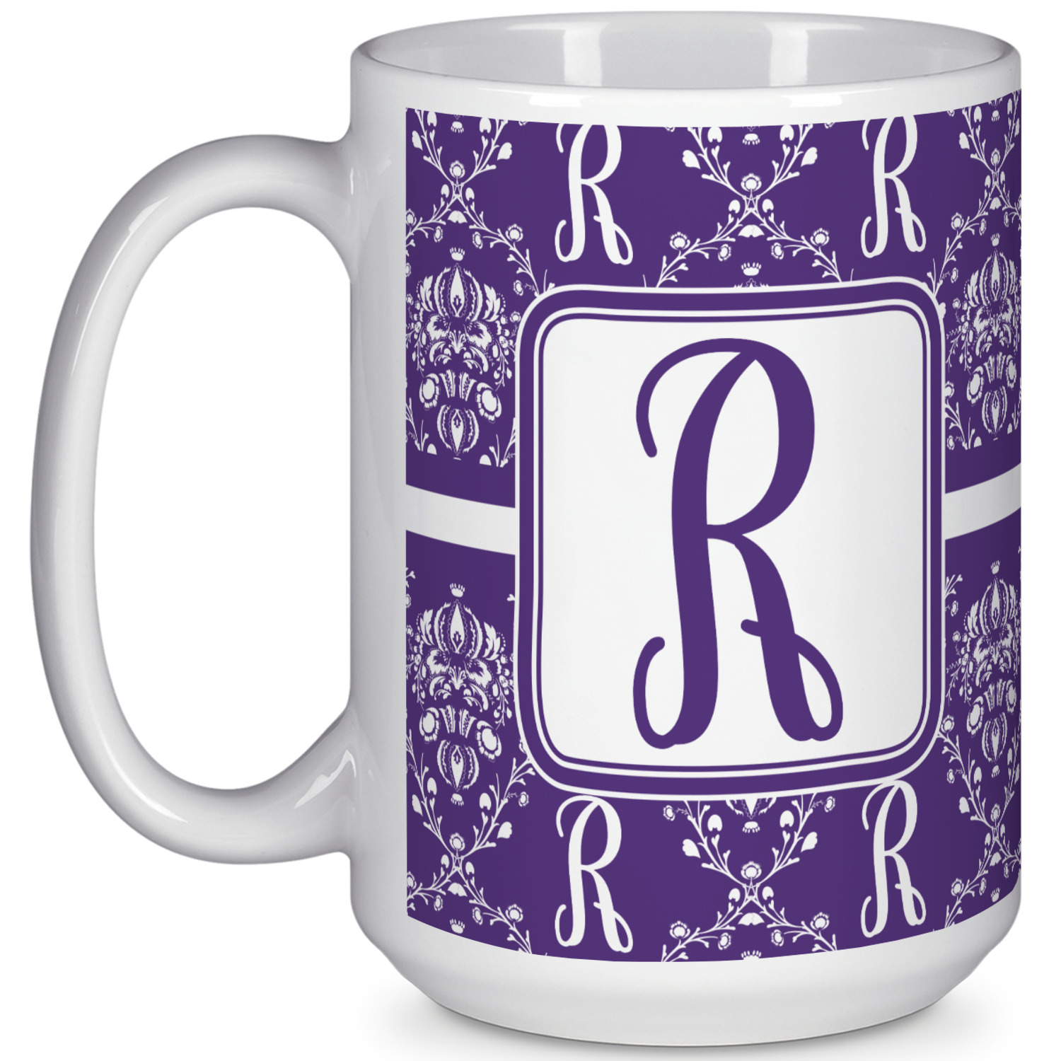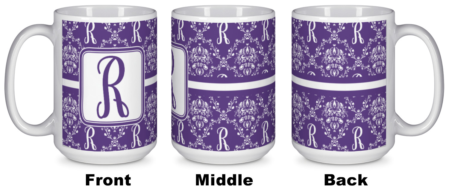 A touch of elegance at its best. The white Damask pattern pops against the backdrop of this rich purple. Personalized with your initial adds that touch of pride to the design. A wide band of purple and white break up the design to make it pleasing to the eye.