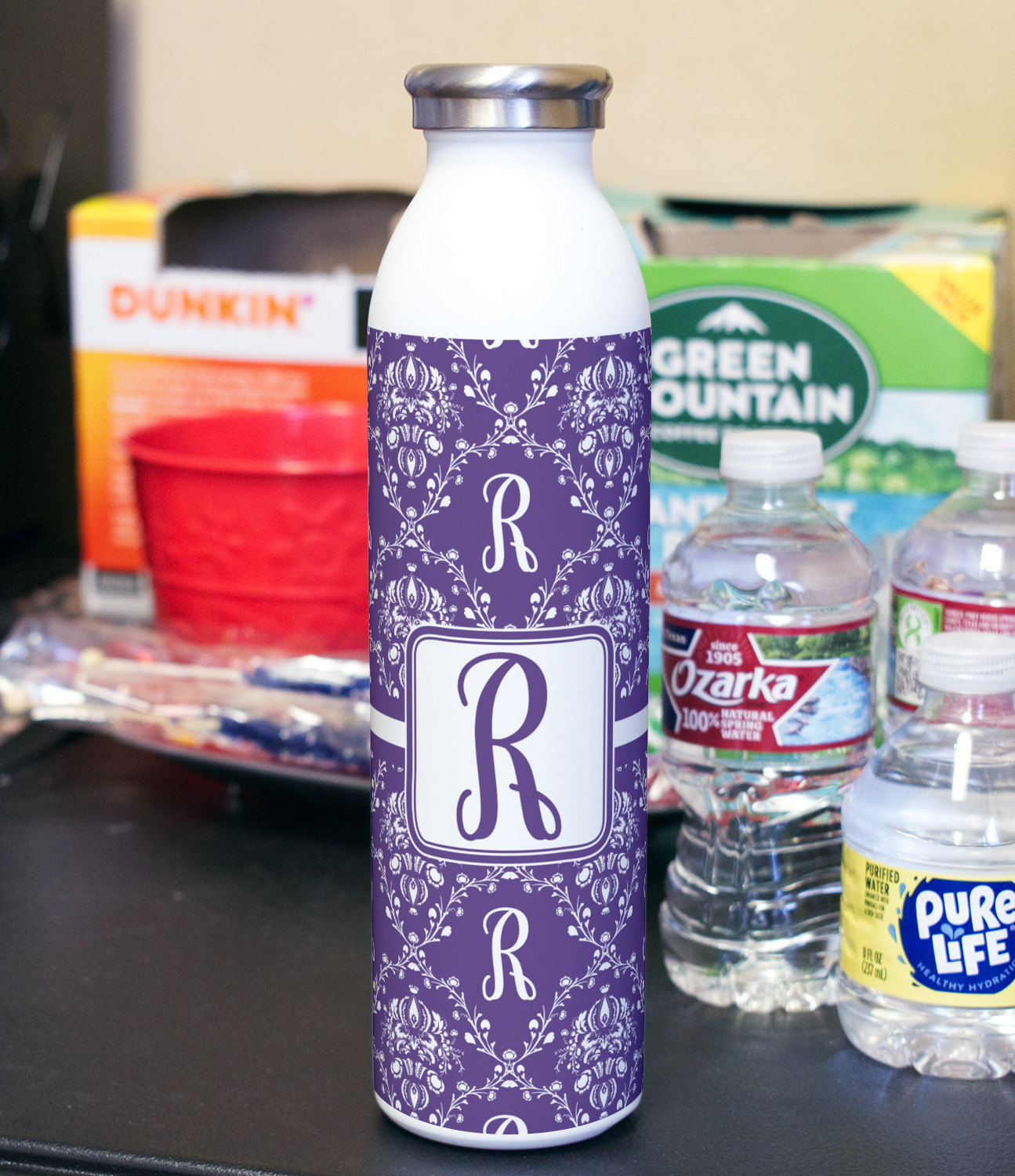 A touch of elegance at its best. The white Damask pattern pops against the backdrop of this rich purple. Personalized with your initial adds that touch of pride to the design. A wide band of purple and white break up the design to make it pleasing to the eye.
