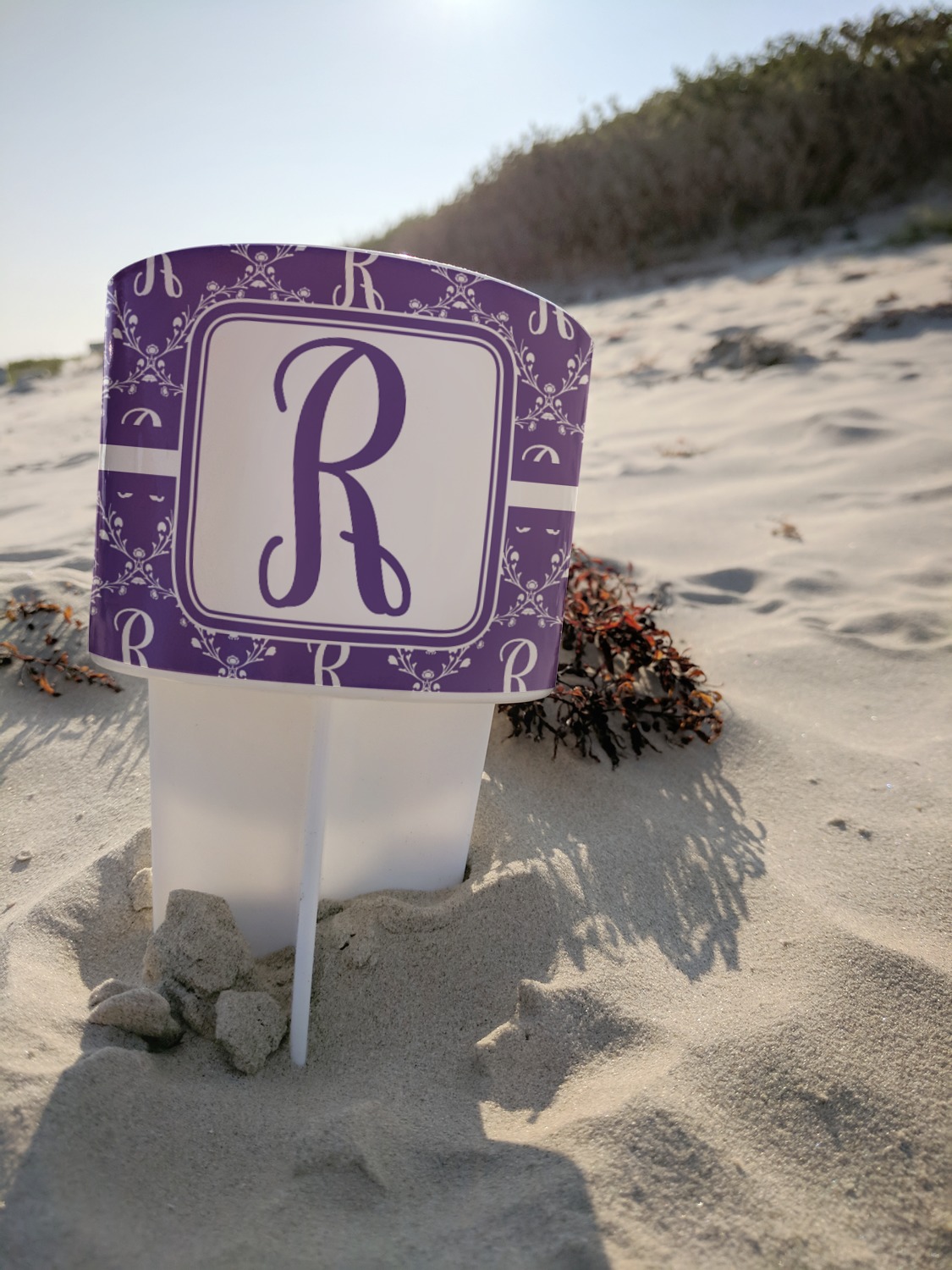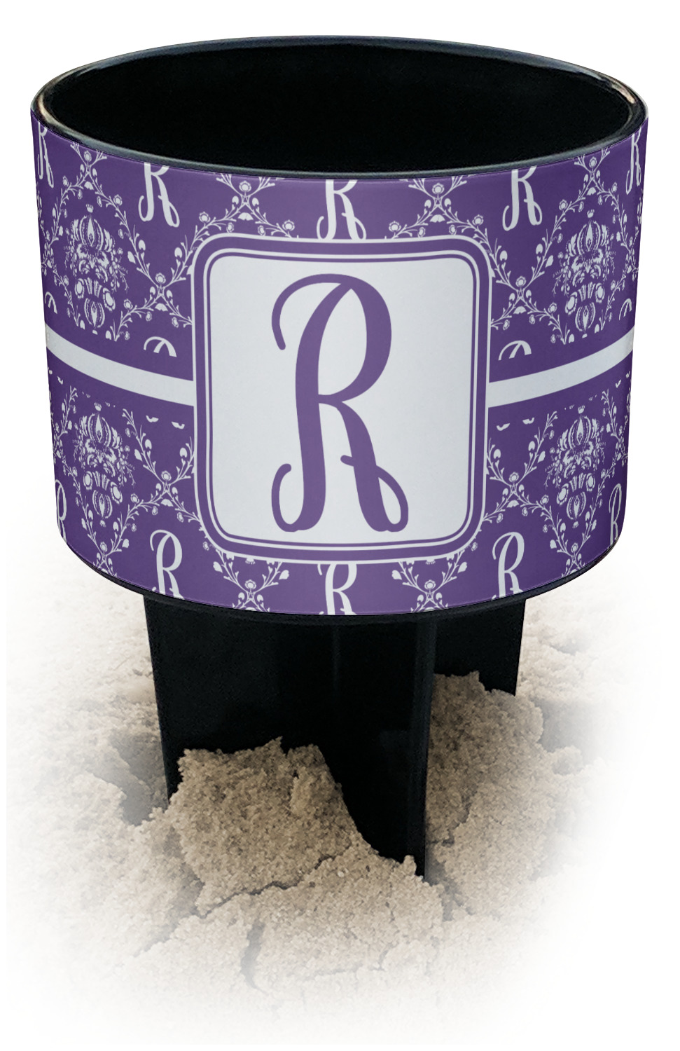 This cup holder has a large stake at its bottom that anchors it to the sand or ground below, while the cup holder rests above the stake. The entire drink holder is made of durable plastic and displays your customization around the cup holder portion. We sell these personalized beach spikers in two different colors: black and white.