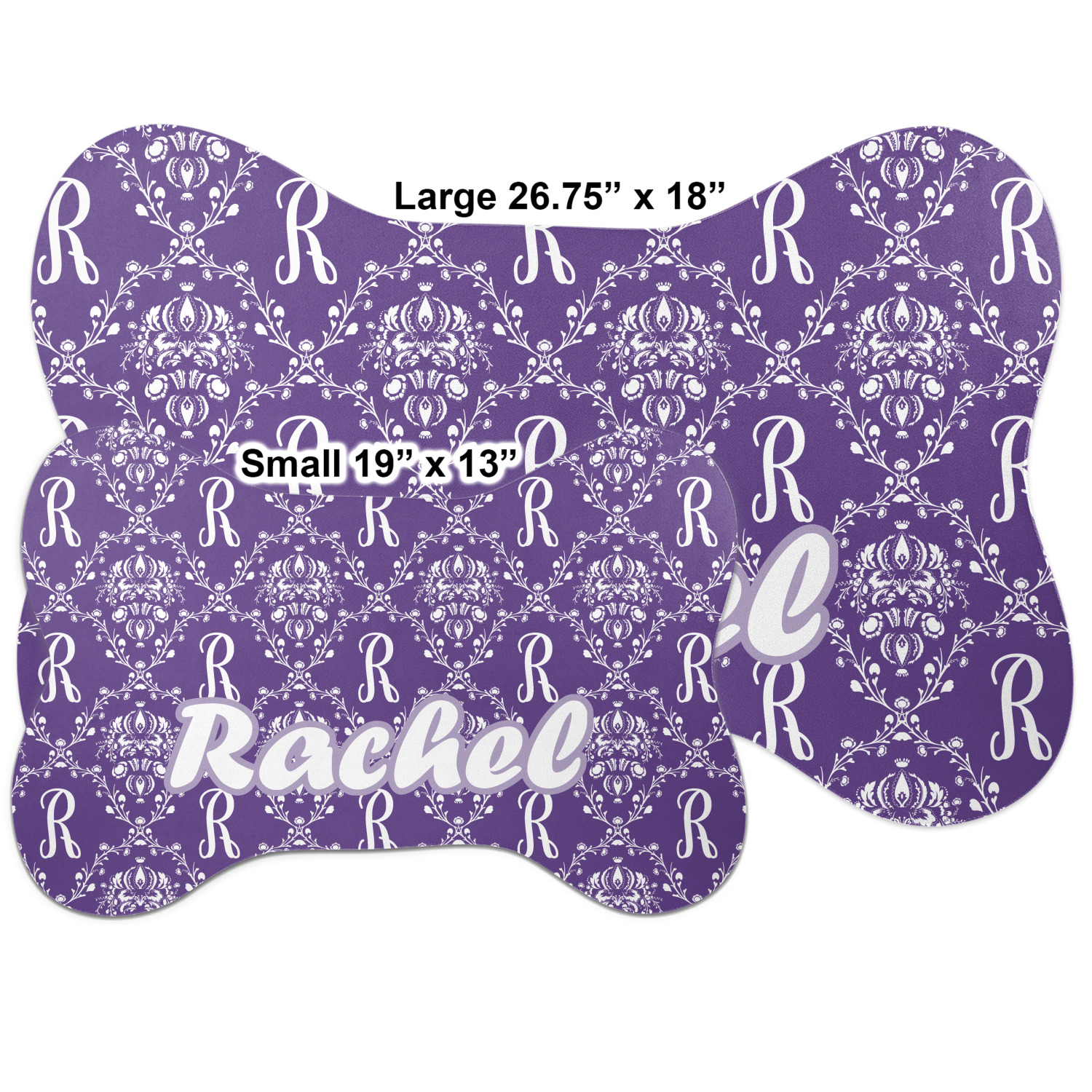 The top of this mat displays your custom design, as it is printed on polyester. To prevent slippage, the underside of the mat is made of rubber. We offer a small dog food mat, suitable for smaller dogs and a large dog food mat for bigger breeds. The small dog food mat is approximately 19 by 13 inches, while the large dog feeding mat measures at approximately 26.75 by 18 inches. Both personalized mats are ideally sized to fit two dog bowls.