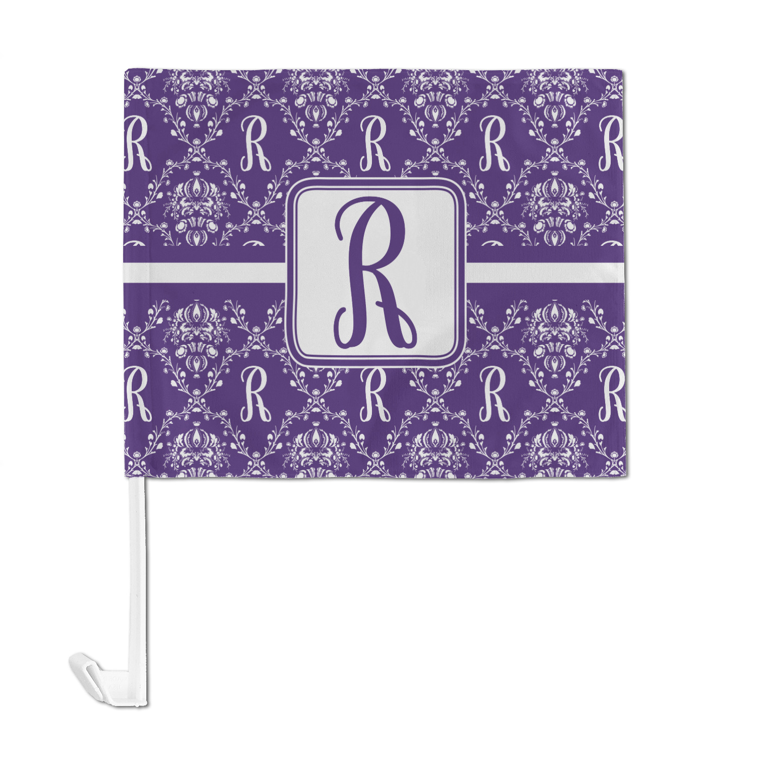 A touch of elegance at its best. The white Damask pattern pops against the backdrop of this rich purple. Personalized with your initial adds that touch of pride to the design. A wide band of purple and white break up the design to make it pleasing to the eye.