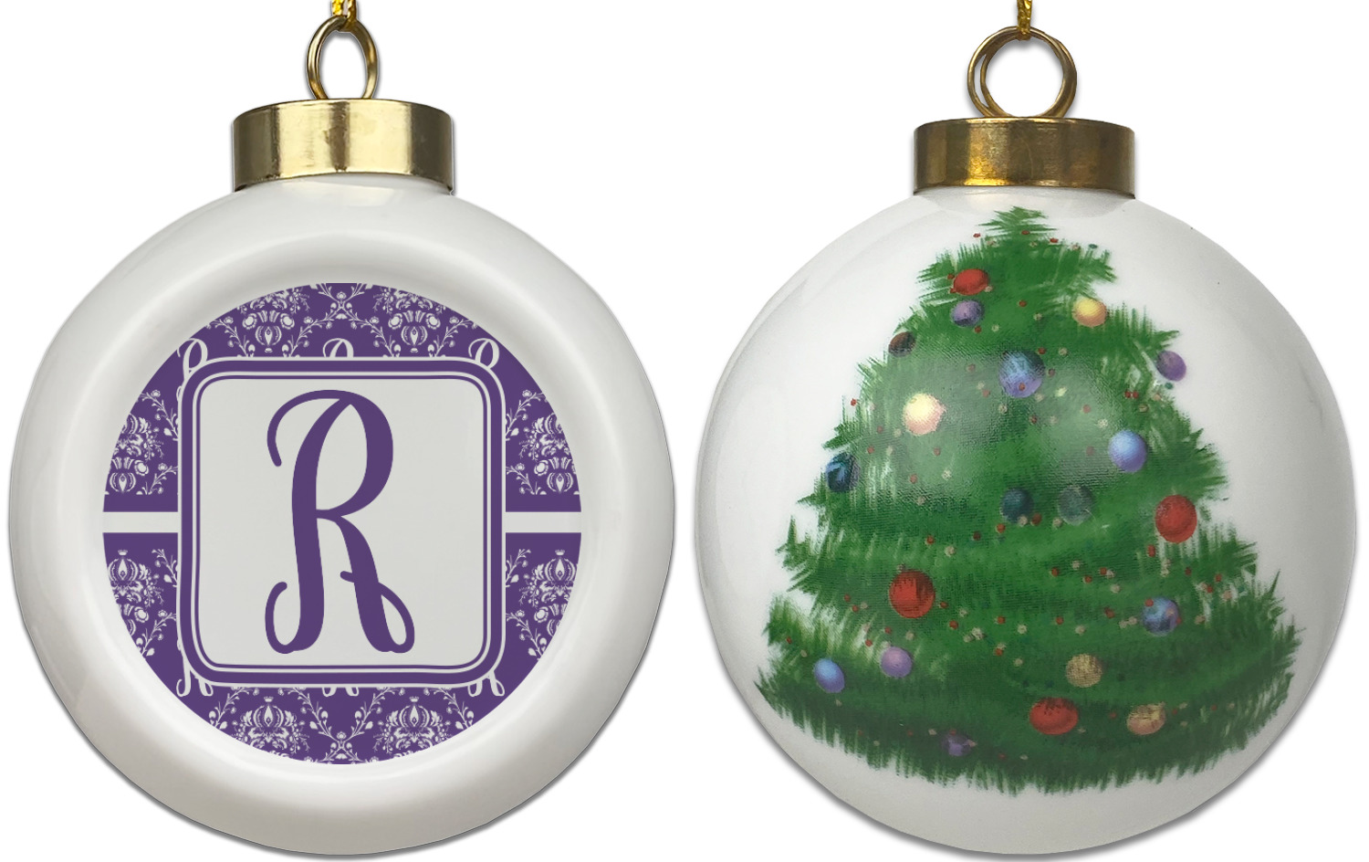 Our Christmas ornaments are a unique ceramic ball shape with a twist as it has a flat face to display your custom design! Select from one of our two design types - Christmas Tree or Poinsettia Garland - to adorn the curved back of your personal design. Each ornament measures 3H x 2.5W x 2D accompanied with a gold string accent for finishing touches to hang on your beautiful Christmas tree!