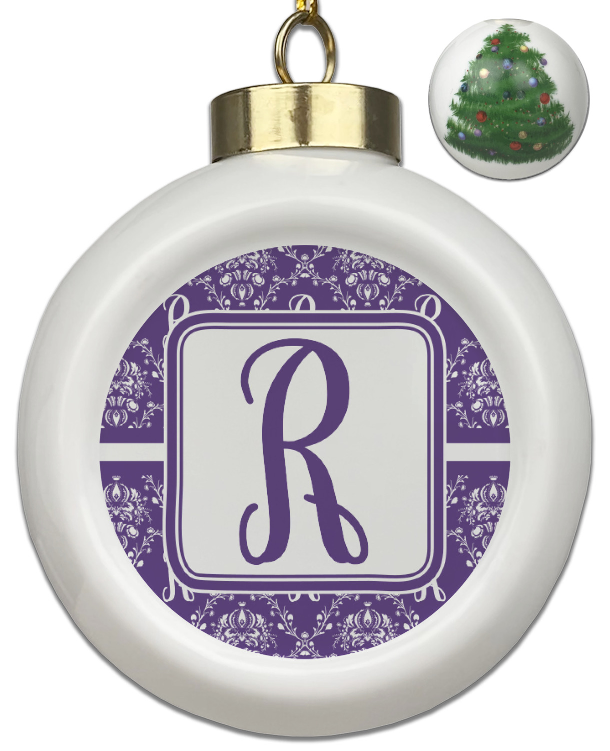 A touch of elegance at its best. The white Damask pattern pops against the backdrop of this rich purple. Personalized with your initial adds that touch of pride to the design. A wide band of purple and white break up the design to make it pleasing to the eye.