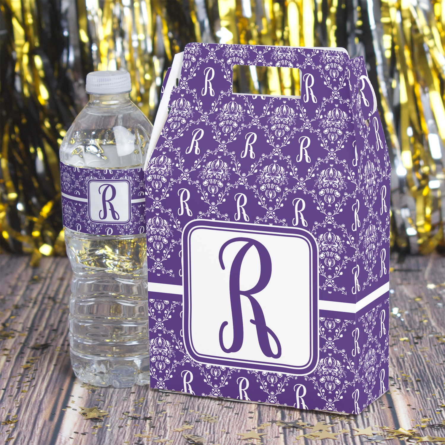 A square white label showcasing a large purple initial adds that finishing touch.