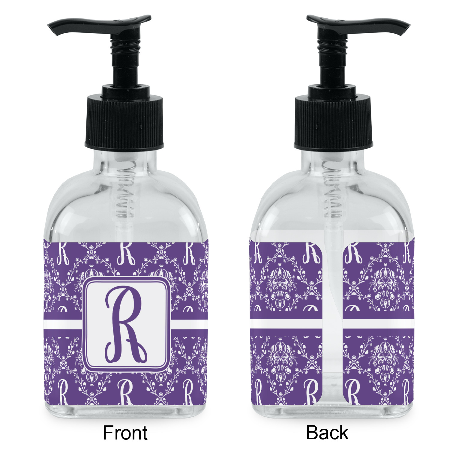 Crafted from a high-quality glass, these soap dispensers and lotion dispensers are durable and robust, while still looking elegant. They are sold with black pumps. Each soap dispenser pump measures at 6.5 by 2.25 inches. On these soap pumps, we display your customized design on a personalized vinyl adhesive on three sides. That way, you can judge how much liquid is in the bottles from the back.