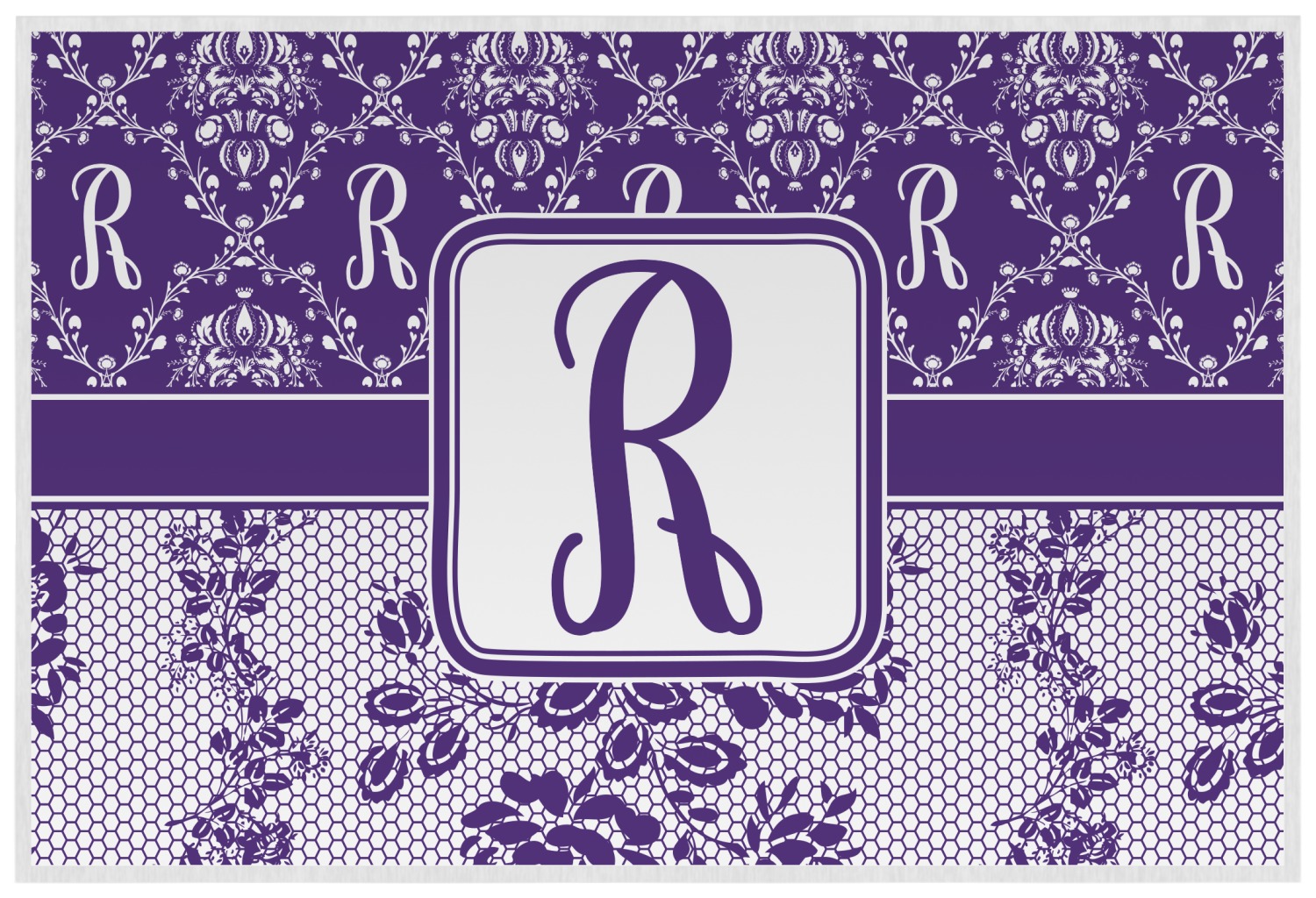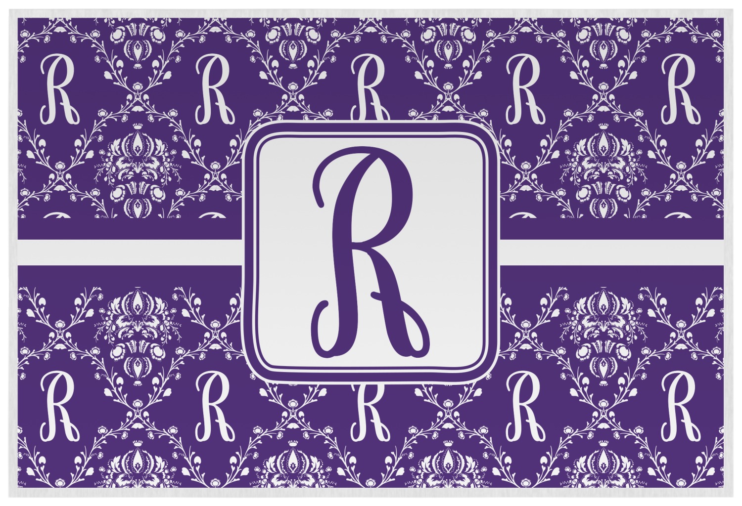 A touch of elegance at its best. The white Damask pattern pops against the backdrop of this rich purple. Personalized with your initial adds that touch of pride to the design. A wide band of purple and white break up the design to make it pleasing to the eye.