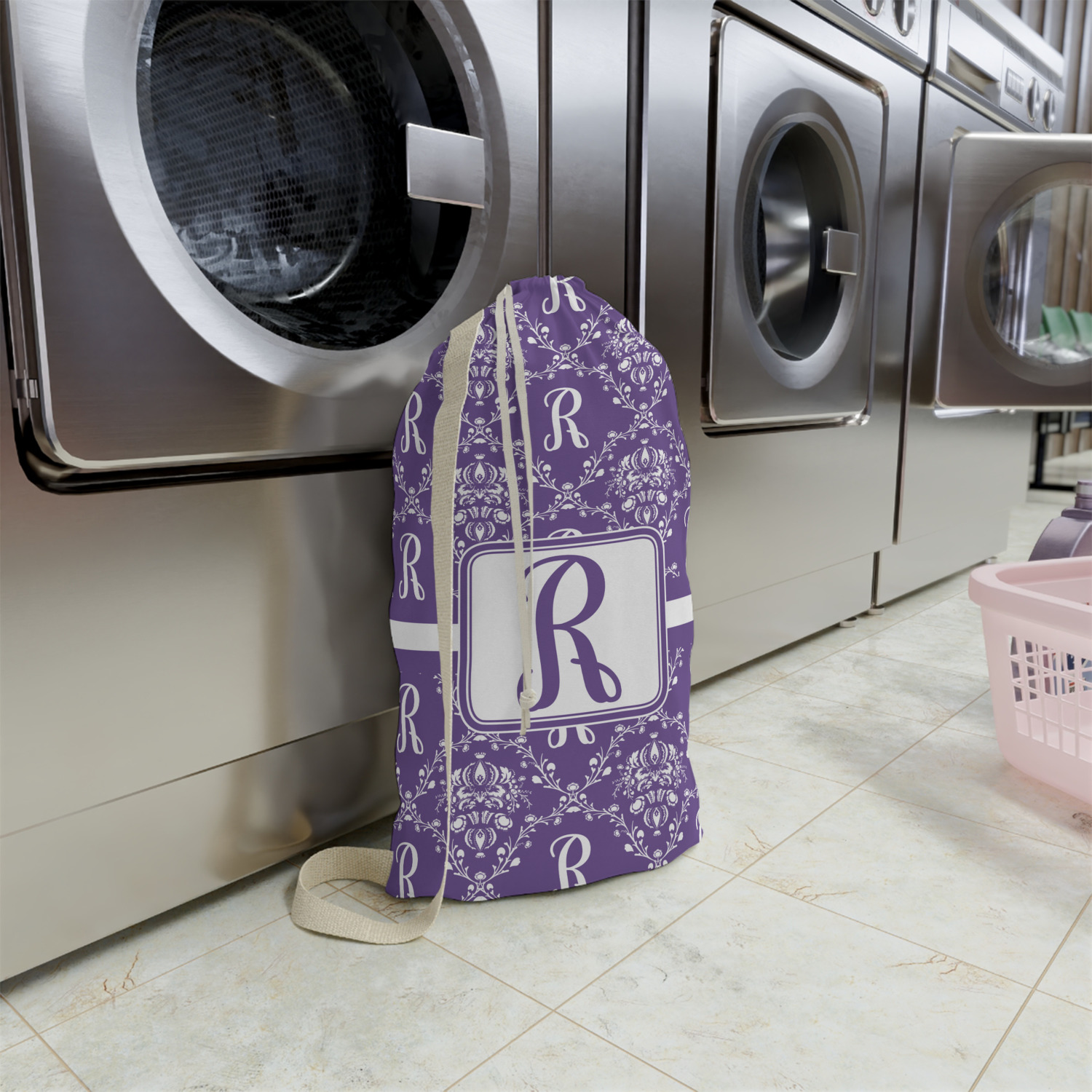 Carry your laundry in style with these customized laundry bags. Available in two sizes, featuring a natural colored woven strap and a cinch cord, these bags hold a lot of clothes or anything else you want to fit in them.