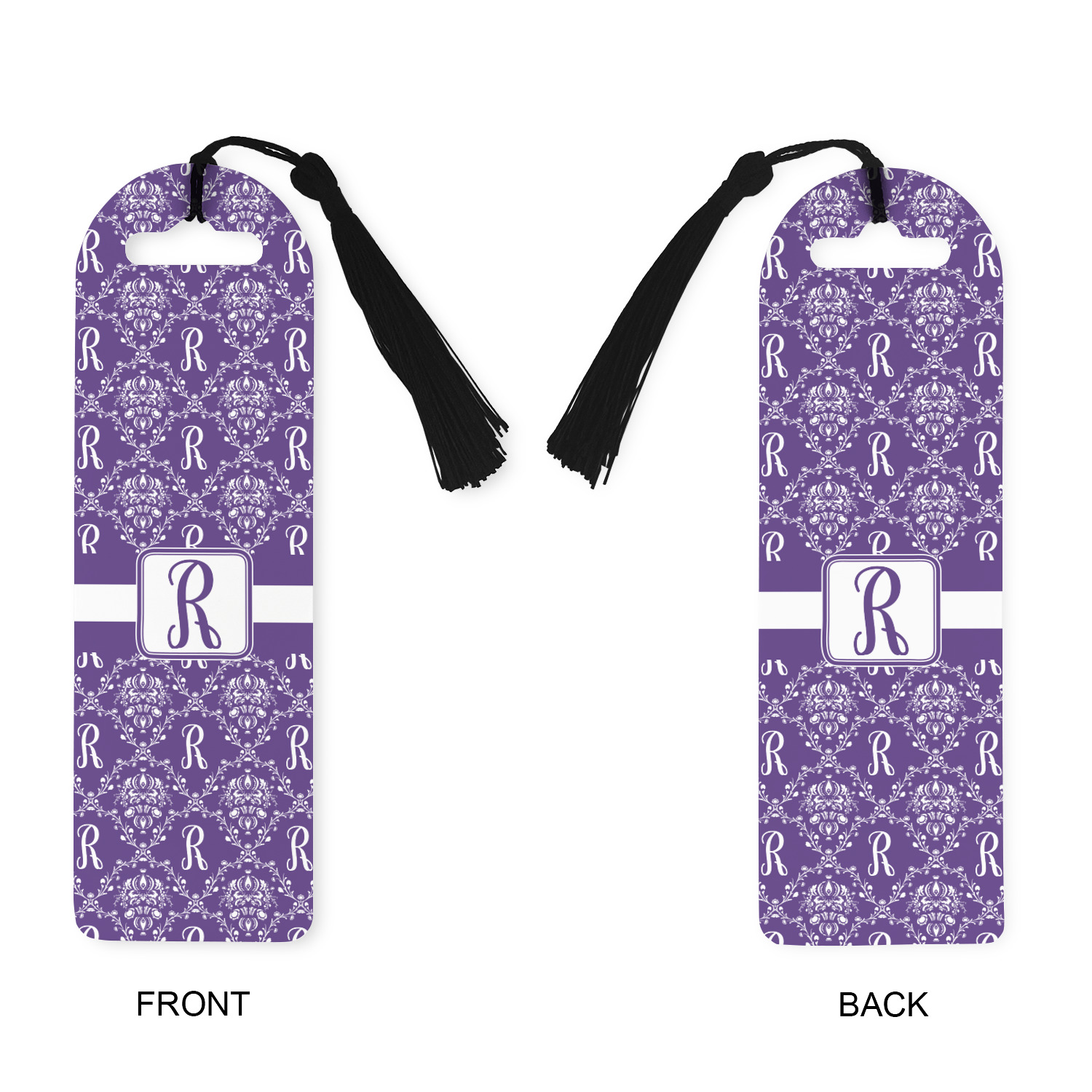 Made from a durable, flexible plastic, these bookmarks are printed with your custom design on them. With the tassel on them they make it easy to find your page in your book. These are a rectangular shape 7 1/4 inches tall with a rounded top and are approximately 2 1/4 inches wide.