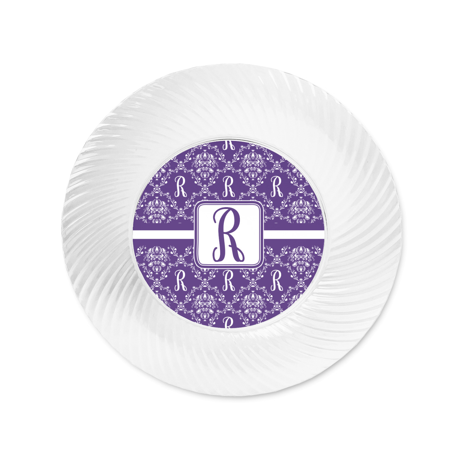 A touch of elegance at its best. The white Damask pattern pops against the backdrop of this rich purple. Personalized with your initial adds that touch of pride to the design. A wide band of purple and white break up the design to make it pleasing to the eye.