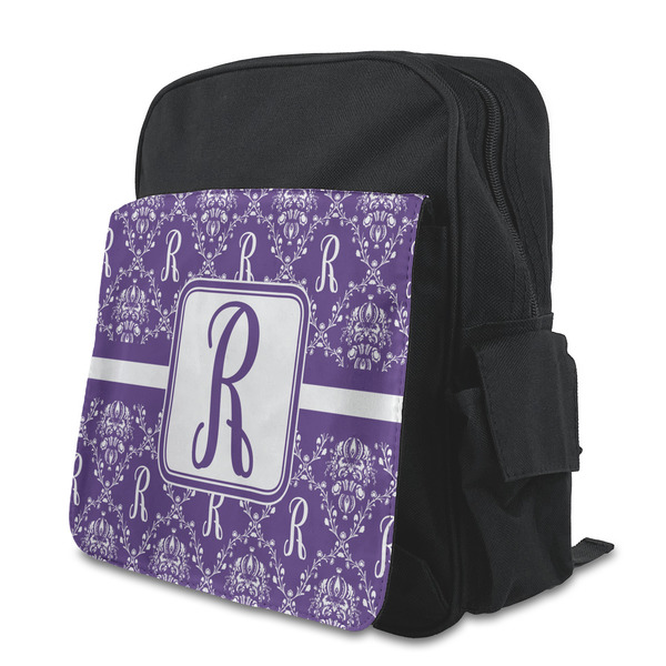 A touch of elegance at its best. The white Damask pattern pops against the backdrop of this rich purple. Personalized with your initial adds that touch of pride to the design. A wide band of purple and white break up the design to make it pleasing to the eye.