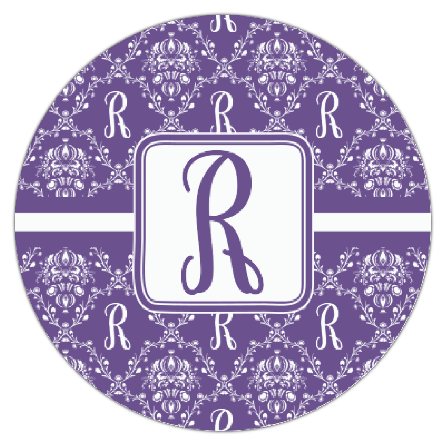 A touch of elegance at its best. The white Damask pattern pops against the backdrop of this rich purple. Personalized with your initial adds that touch of pride to the design. A wide band of purple and white break up the design to make it pleasing to the eye.