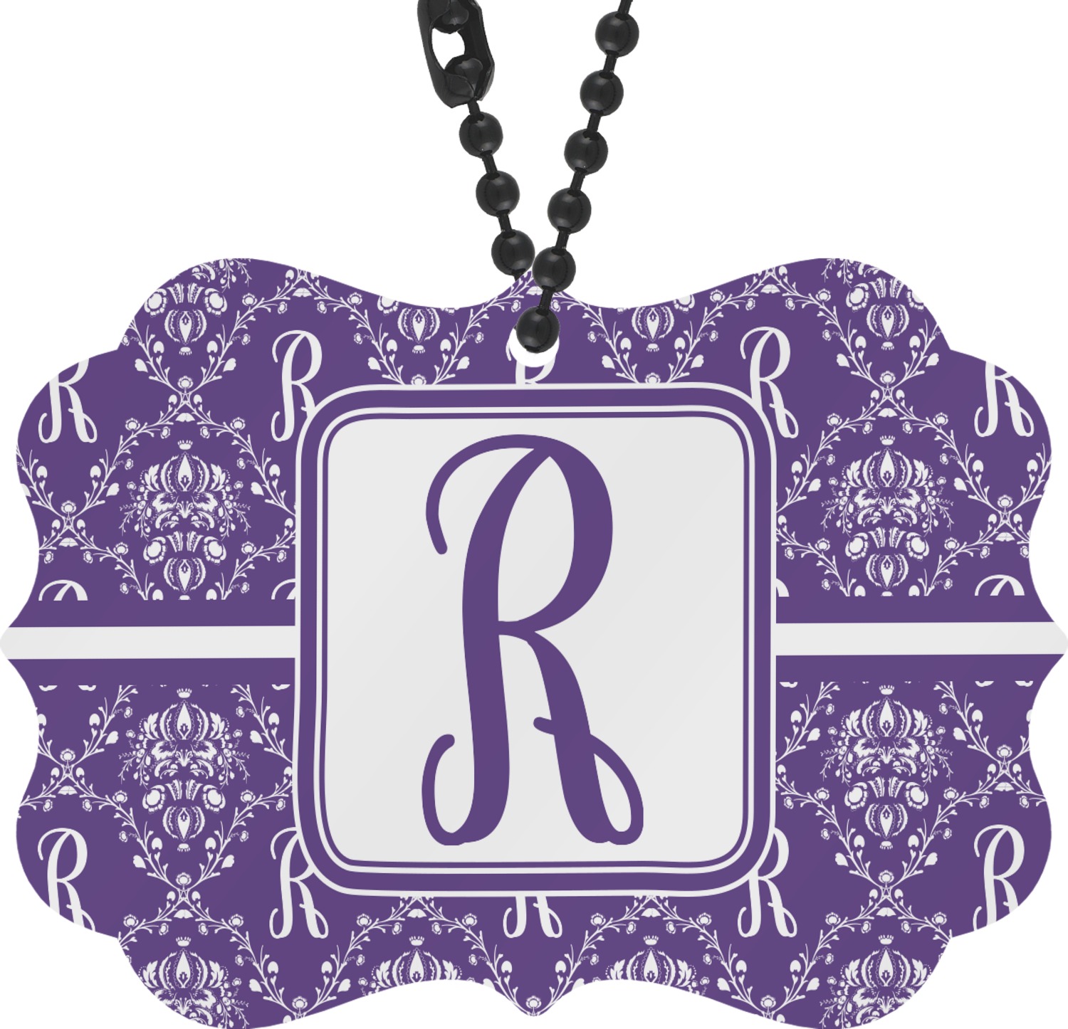 A touch of elegance at its best. The white Damask pattern pops against the backdrop of this rich purple. Personalized with your initial adds that touch of pride to the design. A wide band of purple and white break up the design to make it pleasing to the eye.
