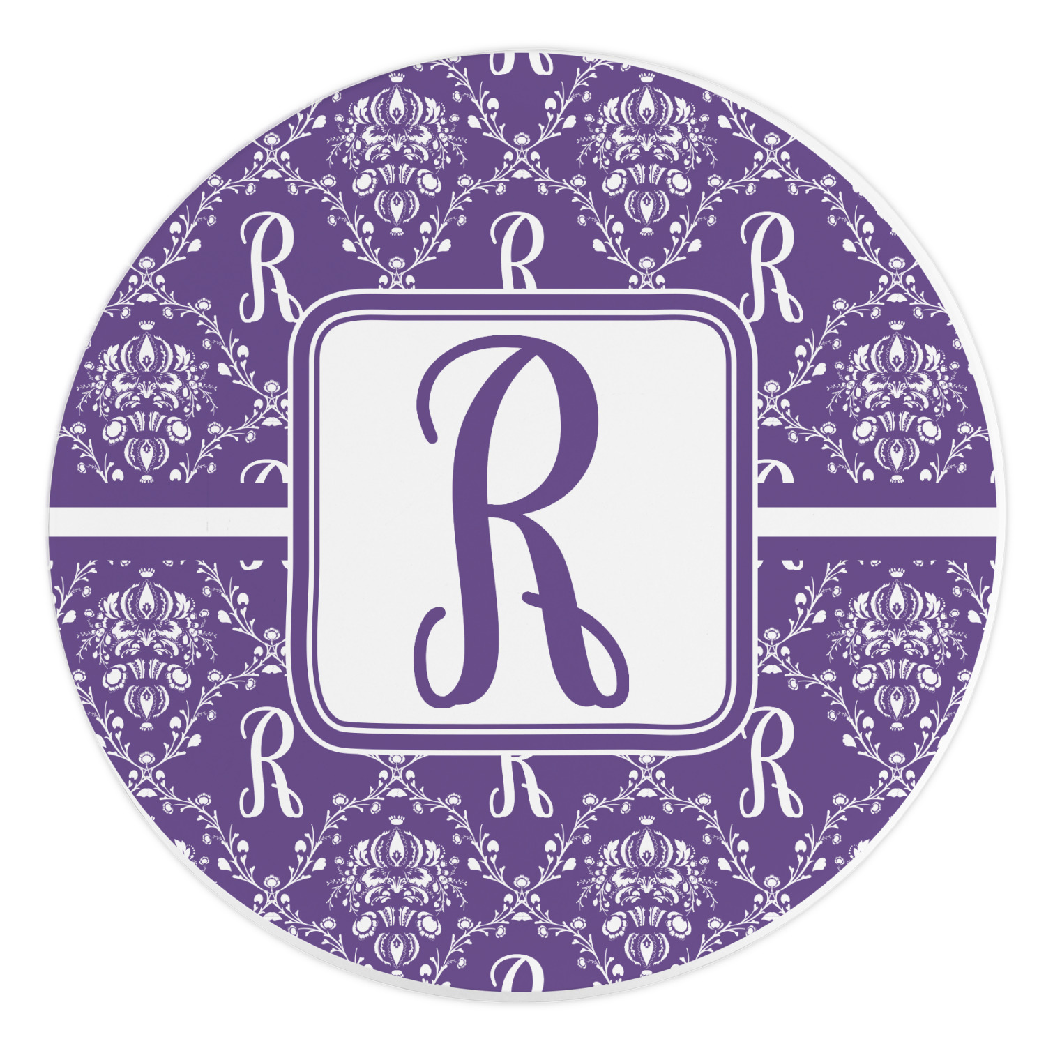 A touch of elegance at its best. The white Damask pattern pops against the backdrop of this rich purple. Personalized with your initial adds that touch of pride to the design. A wide band of purple and white break up the design to make it pleasing to the eye.