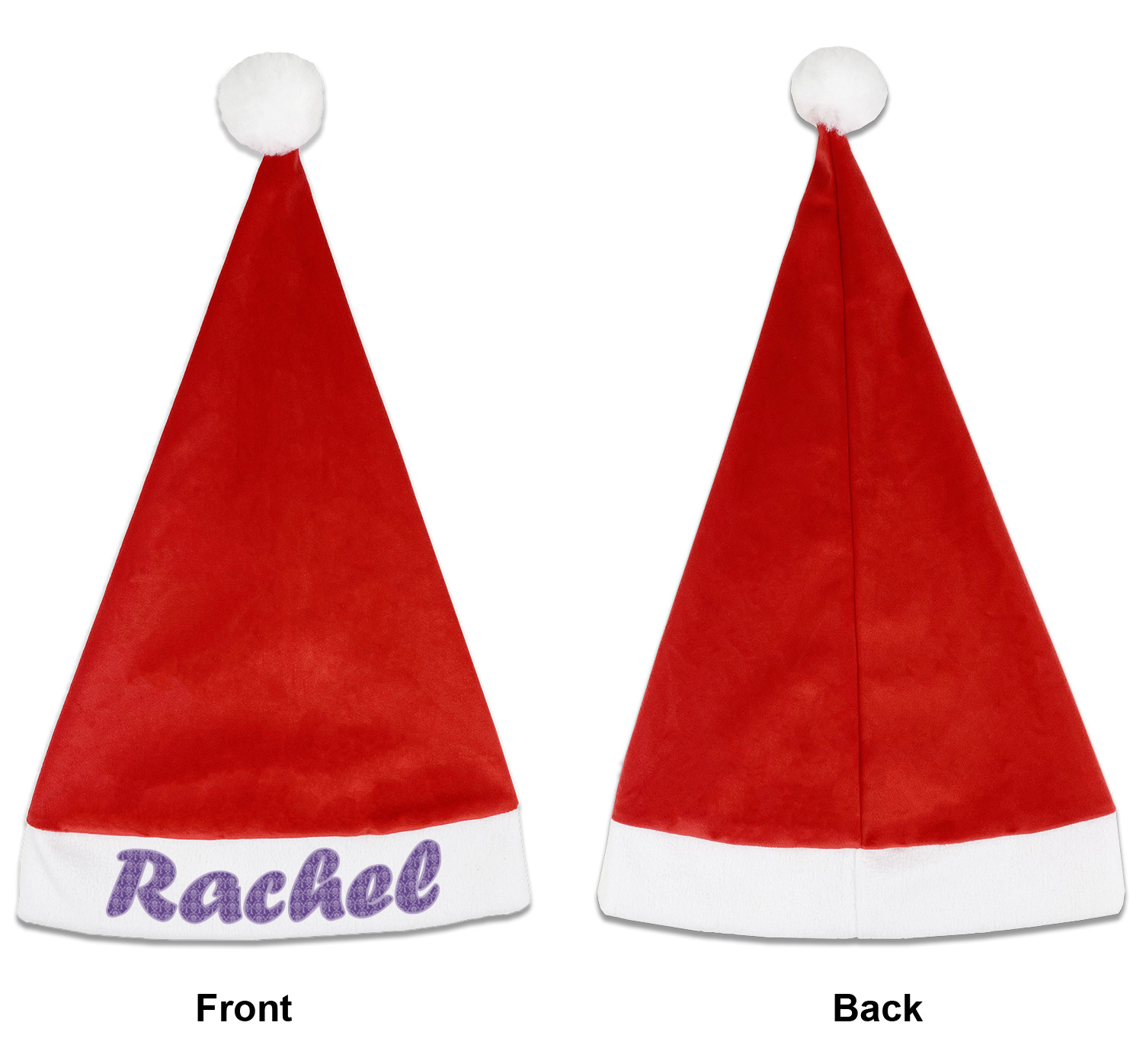 Our Santa hats are a soft, velvety polyester material. These customizable Santa hats are a classic red with white brimming and pom pom ball hanging off the hat tail just like Santa Claus! Each personalized Santa hat is approximately 17.5 L x 11.8 W. We offer two different styles to print your designs on the white brim - front or front & back.