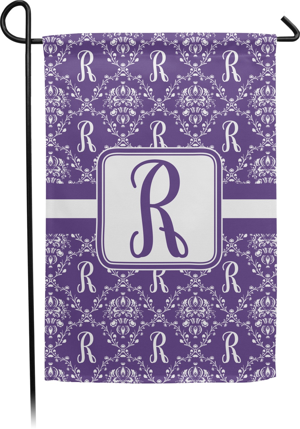 A touch of elegance at its best. The white Damask pattern pops against the backdrop of this rich purple. Personalized with your initial adds that touch of pride to the design. A wide band of purple and white break up the design to make it pleasing to the eye.