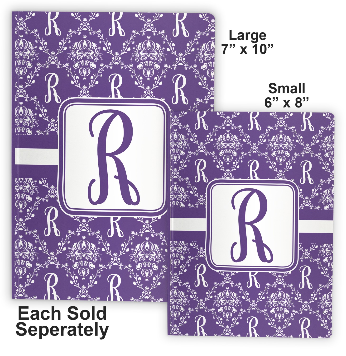 We offer these notebooks in two different sizes. The small notebook is 8" x 5.75", and fits snugly in purses or totes. The large notebook measures at 10" x 7.25", and can be carried in briefcases and backpacks.