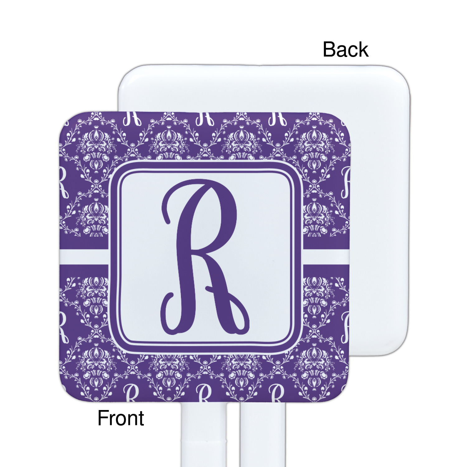 A touch of elegance at its best. The white Damask pattern pops against the backdrop of this rich purple. Personalized with your initial adds that touch of pride to the design. A wide band of purple and white break up the design to make it pleasing to the eye.