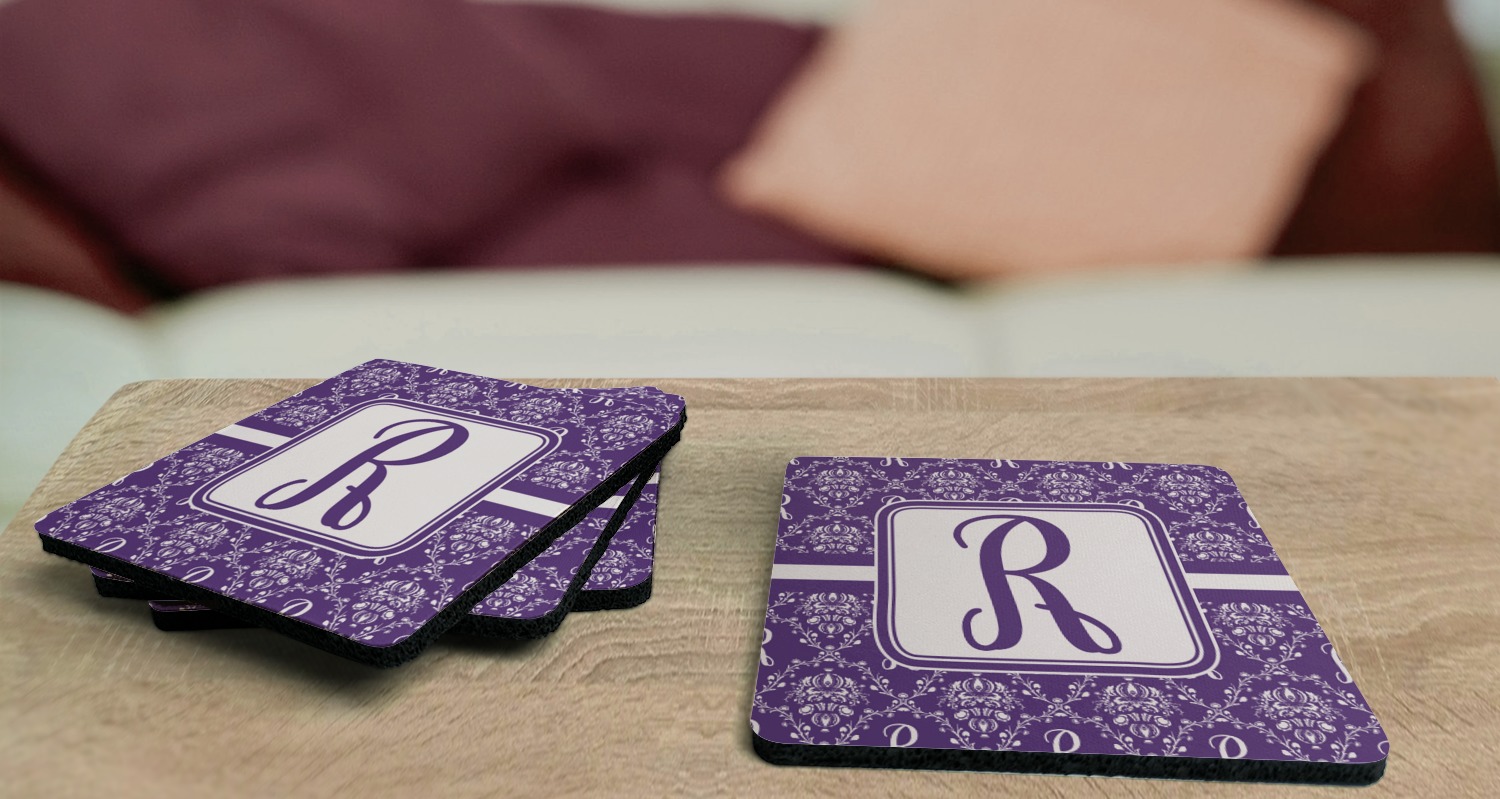 These drink coasters have a smooth, polyester top and a textured, rubber backing on its bottom. The non-slip rubber backing underneath works to keep any spills at bay. At 4 by 4 by 0.25 inches thick, these custom coasters are a suitable size for most drinkware. Your personalization is displayed atop the face of the cup coaster. We sell these rubber coasters in two different shapes: square and round. You can buy each shape as singulars or as a set of 4.