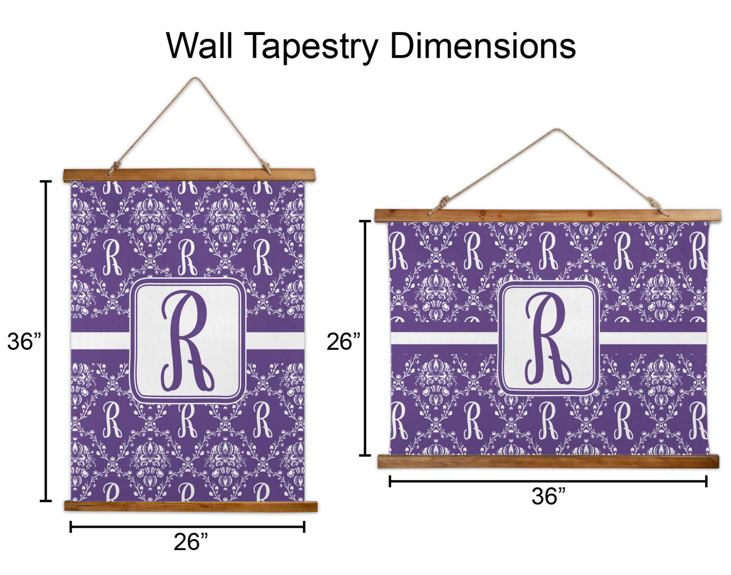 Made in two different orientations - portrait or landscape - both are 26" x 36". Your design is printed on a high quality polyester fabric with hemmed edges. The wood on the top and bottom of the tapestry is 1.25" tall and 0.25" thick and there are two pieces on top and bottom which sandwich the fabric.