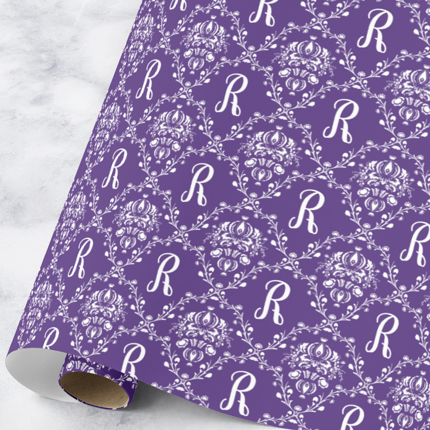 A touch of elegance at its best. The white Damask pattern pops against the backdrop of this rich purple. Personalized with your initial adds that touch of pride to the design. A wide band of purple and white break up the design to make it pleasing to the eye.