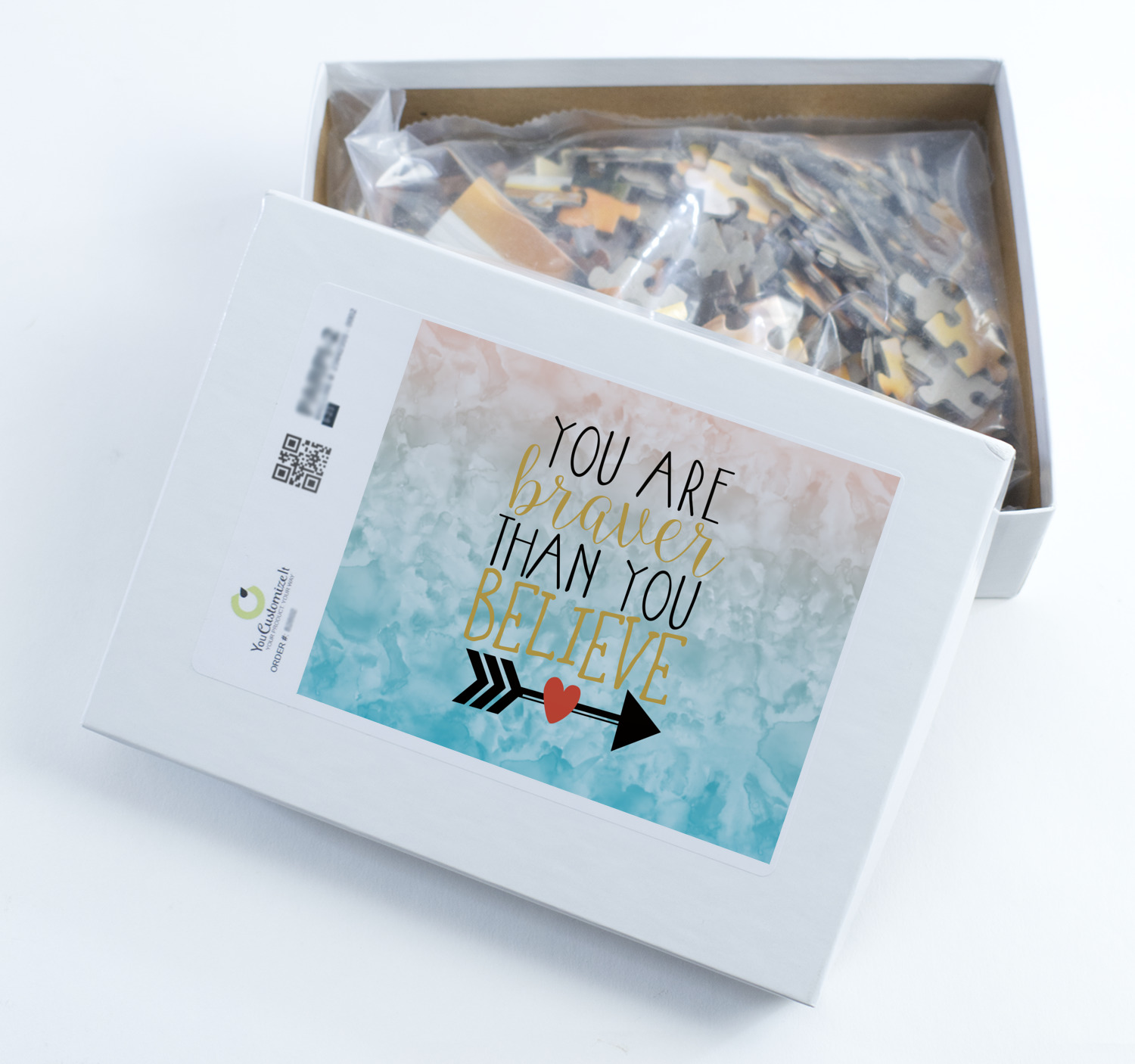 You can also upload your logo or art that you or your kids drew. To create more challenging jigsaw puzzles, you can create a pattern from with your logo or artwork. You can also add other elements such as text or personalization.