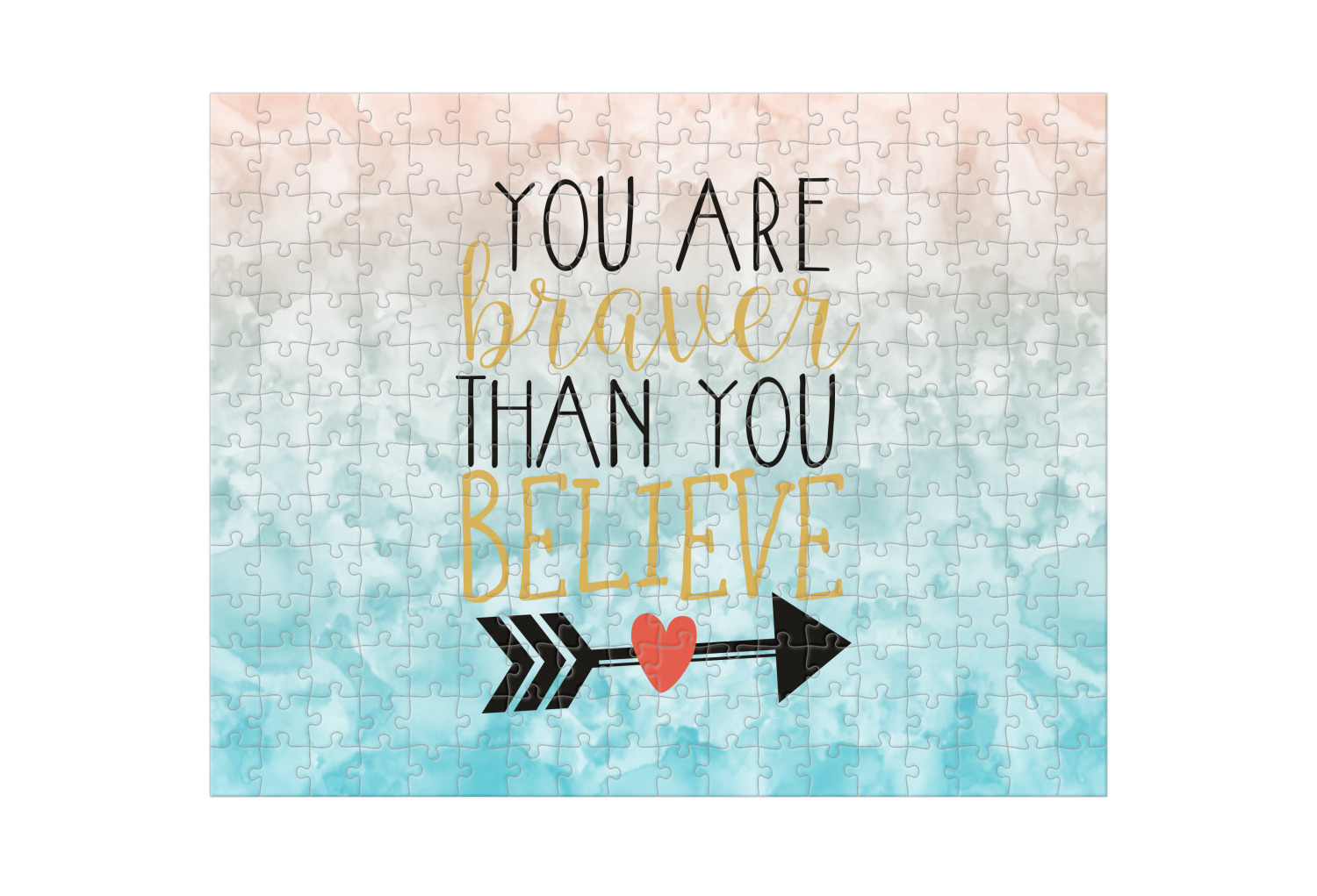 This design features one of our many inspirational quotes. This quote in particular reminds you that "you are braver than you believe." This uplifting quote has beatuiful and playful fonts to create it. An arrow sits below the quote to symbolize the bravery of the heart. The background is a lovely hombre watercolor pattern of teal/turquoise and peach. The calming colors make for a lovely inspirational design.