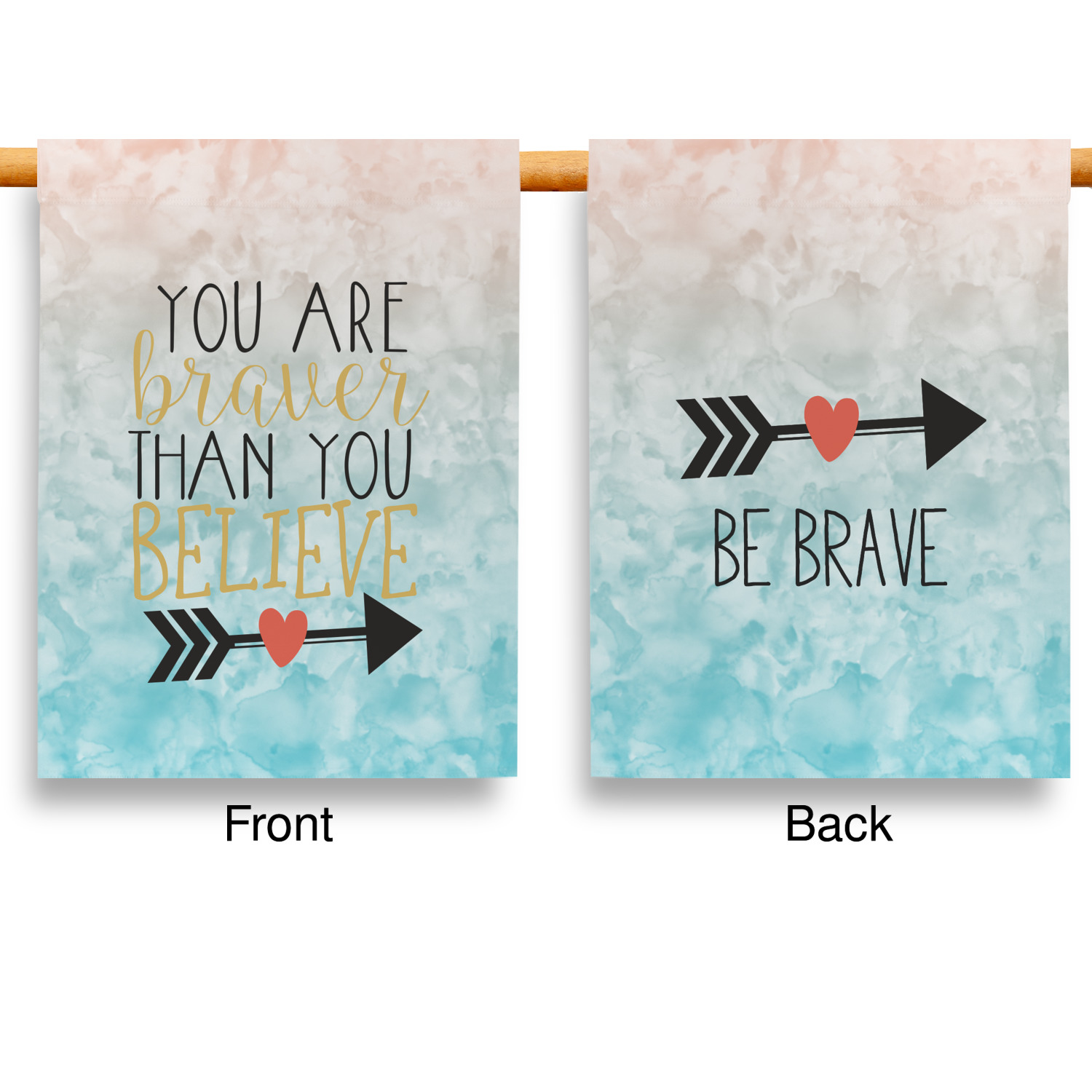 This design features one of our many inspirational quotes. This quote in particular reminds you that "you are braver than you believe." This uplifting quote has beatuiful and playful fonts to create it. An arrow sits below the quote to symbolize the bravery of the heart. The background is a lovely hombre watercolor pattern of teal/turquoise and peach. The calming colors make for a lovely inspirational design.