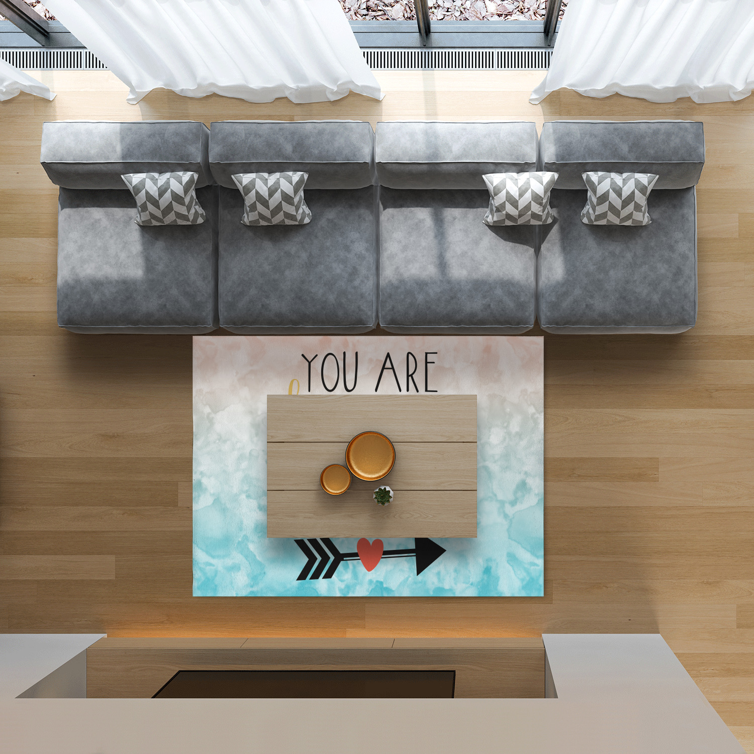 This design features one of our many inspirational quotes. This quote in particular reminds you that "you are braver than you believe." This uplifting quote has beatuiful and playful fonts to create it. An arrow sits below the quote to symbolize the bravery of the heart. The background is a lovely hombre watercolor pattern of teal/turquoise and peach. The calming colors make for a lovely inspirational design.