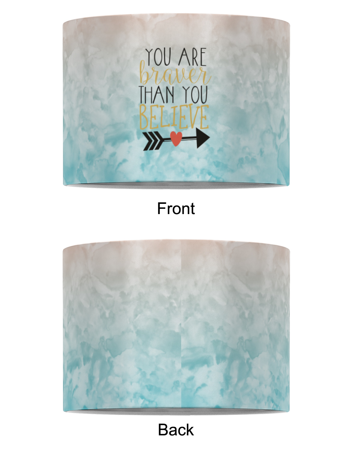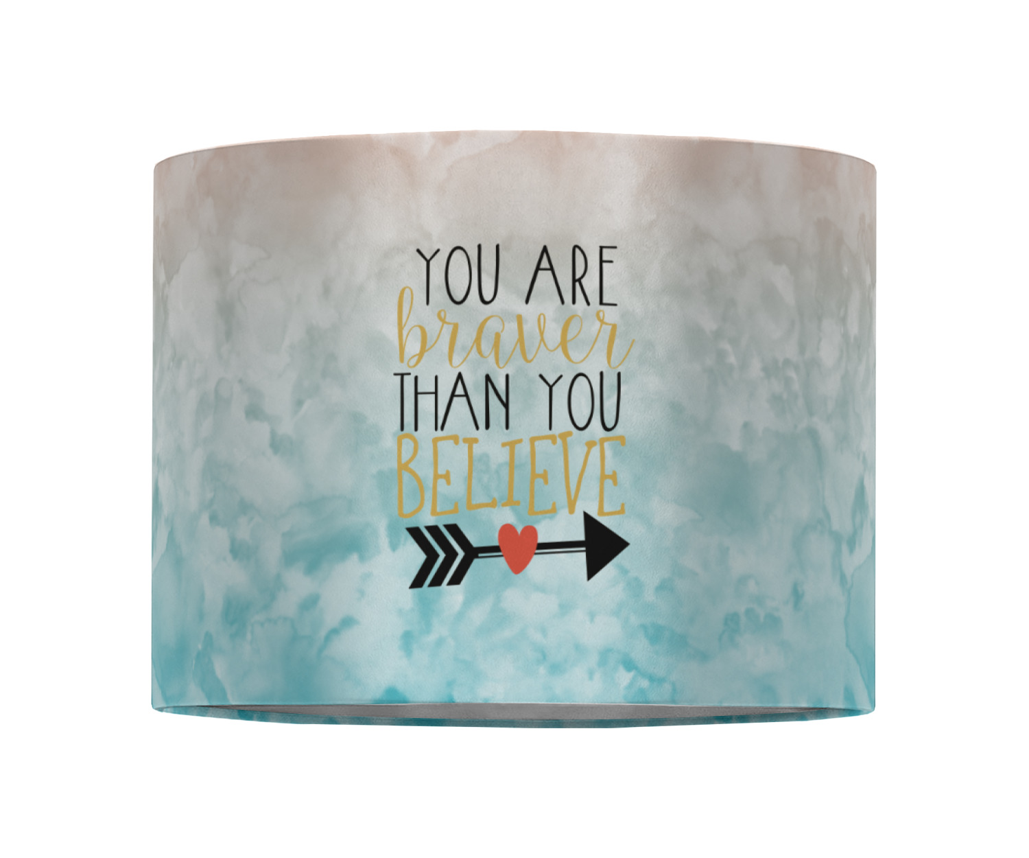 This design features one of our many inspirational quotes. This quote in particular reminds you that "you are braver than you believe." This uplifting quote has beatuiful and playful fonts to create it. An arrow sits below the quote to symbolize the bravery of the heart. The background is a lovely hombre watercolor pattern of teal/turquoise and peach. The calming colors make for a lovely inspirational design.