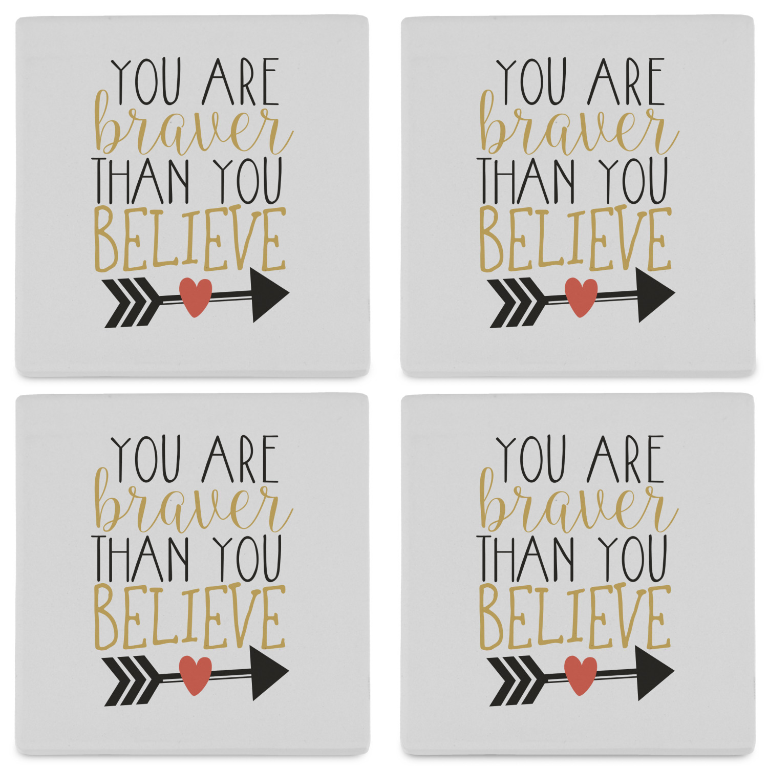 This design features one of our many inspirational quotes. This quote in particular reminds you that "you are braver than you believe." This uplifting quote has beatuiful and playful fonts to create it. An arrow sits below the quote to symbolize the bravery of the heart. The background is a lovely hombre watercolor pattern of teal/turquoise and peach. The calming colors make for a lovely inspirational design.