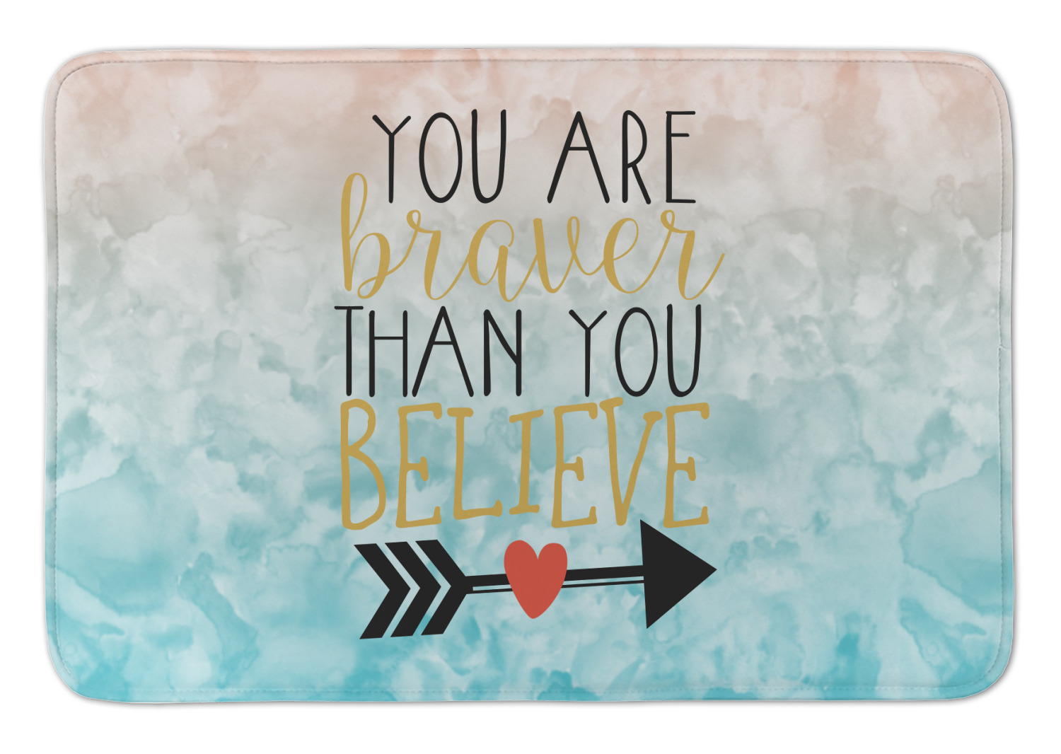 This design features one of our many inspirational quotes. This quote in particular reminds you that "you are braver than you believe." This uplifting quote has beatuiful and playful fonts to create it. An arrow sits below the quote to symbolize the bravery of the heart. The background is a lovely hombre watercolor pattern of teal/turquoise and peach. The calming colors make for a lovely inspirational design.