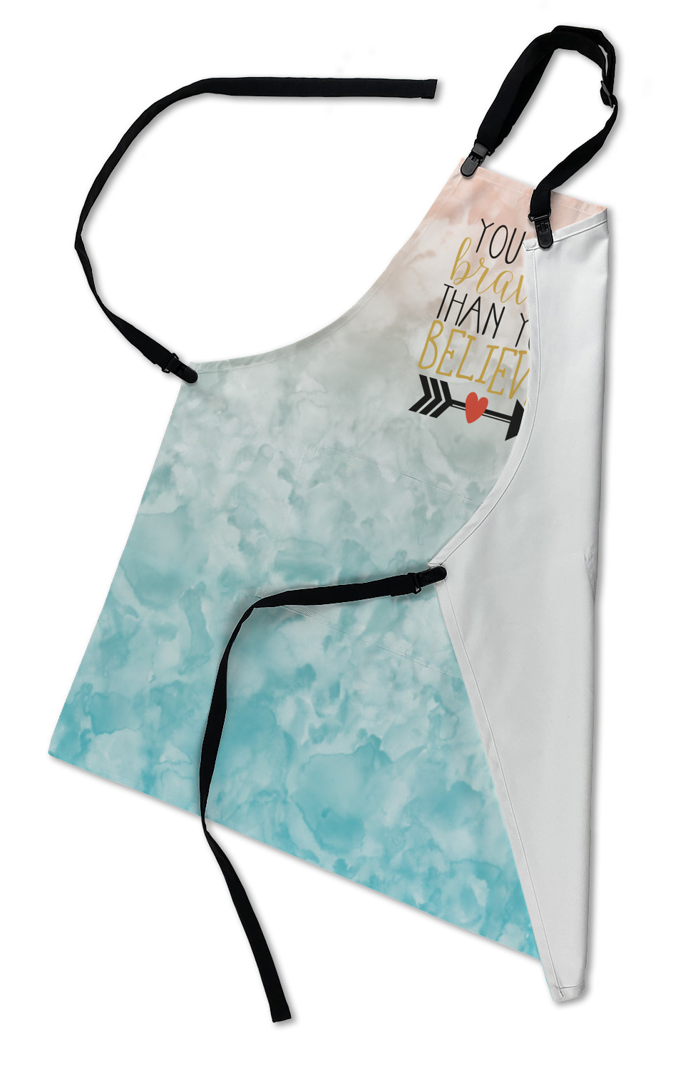 Our aprons are a lightweight yet durable polyester material. We offer two styles of aprons, one without pockets and one with two pockets adorning the center near the waistline. Each apron is one size* and comes with adjustable straps for both the neckline and waist. We print your custom design on the front of the apron to display your creativity!