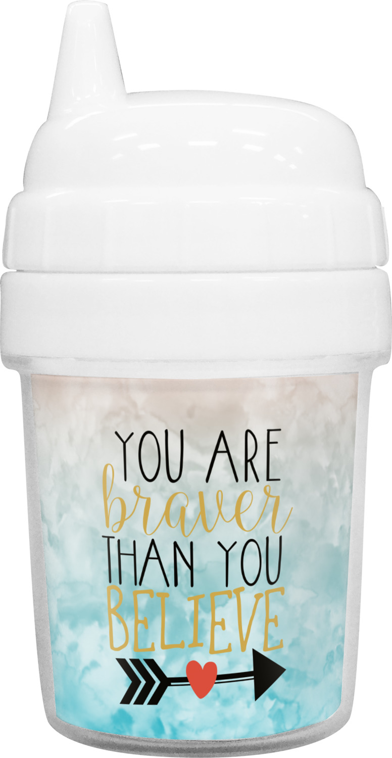 Our toddler cups are free of BPA, and have a twist-open lid so that you can easily fill and clean these cups for your young ones. Each cup also comes with a sippy nozzle to reduce spills. We offer these custom sippy cups in two different sizes; we have a baby sippy cup that holds 5 ounces, and a toddler sippy cup that holds 10 ounces. Your customization is printed on a premium glossy media insert that is placed within these toddler drinking cups.