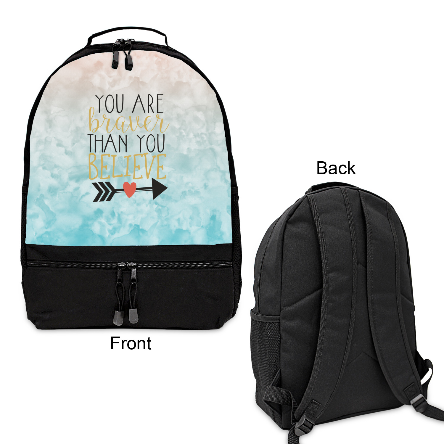 This design features one of our many inspirational quotes. This quote in particular reminds you that "you are braver than you believe." This uplifting quote has beatuiful and playful fonts to create it. An arrow sits below the quote to symbolize the bravery of the heart. The background is a lovely hombre watercolor pattern of teal/turquoise and peach. The calming colors make for a lovely inspirational design.