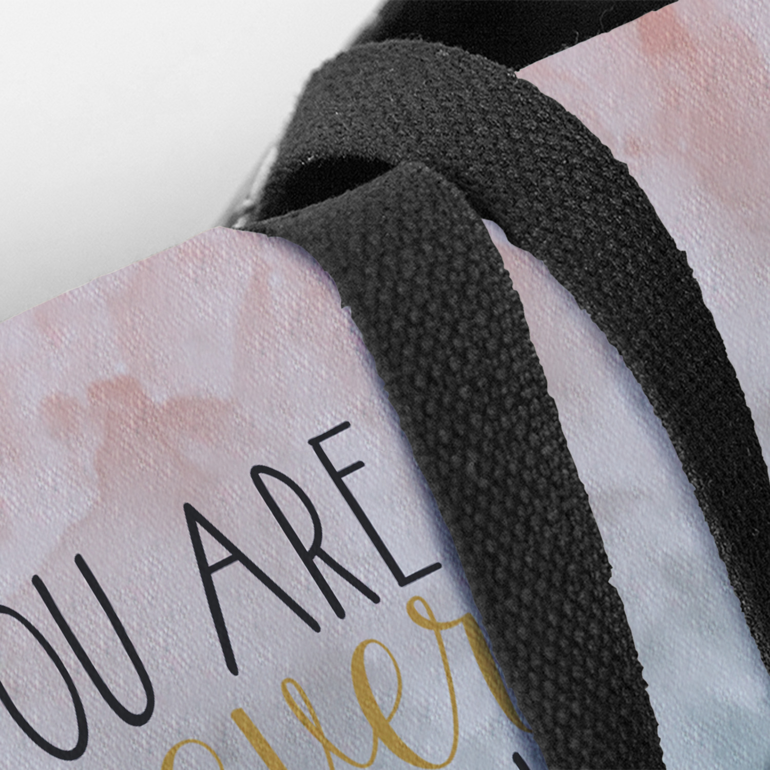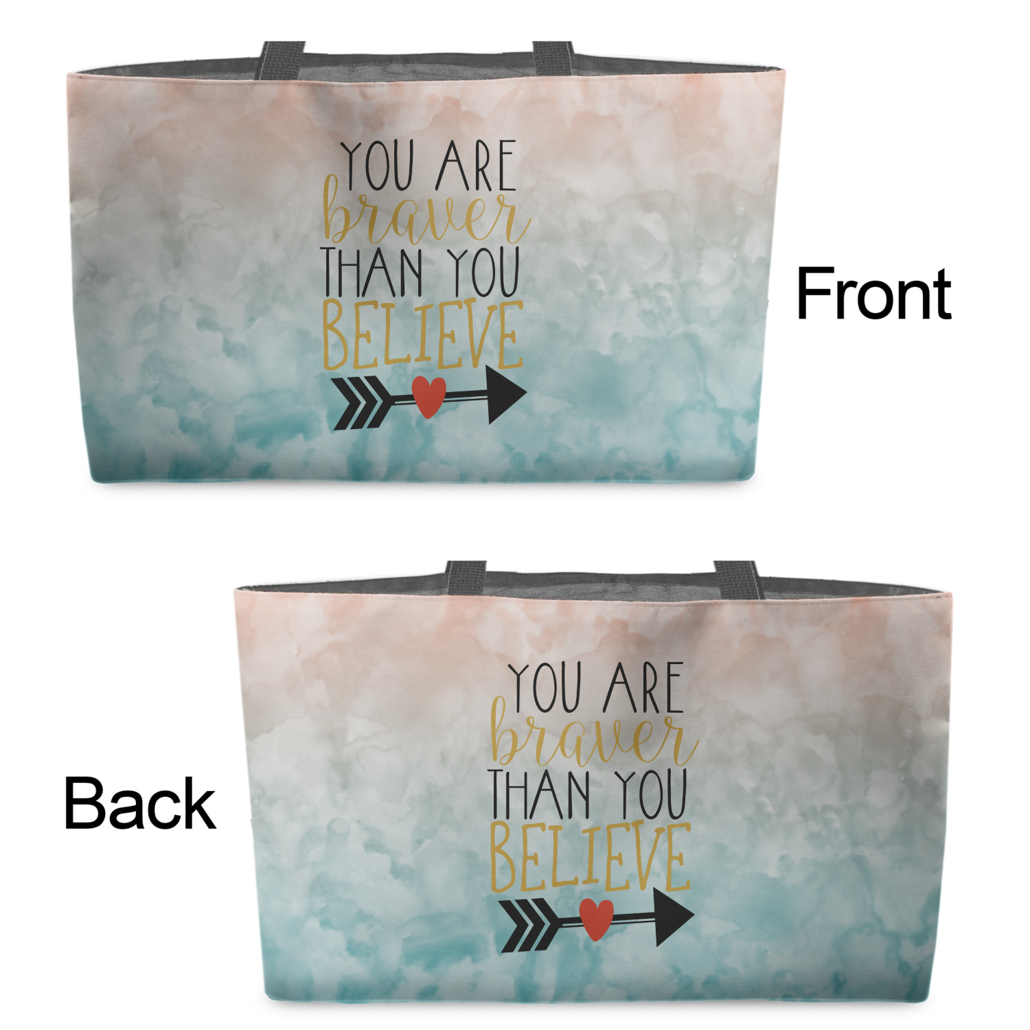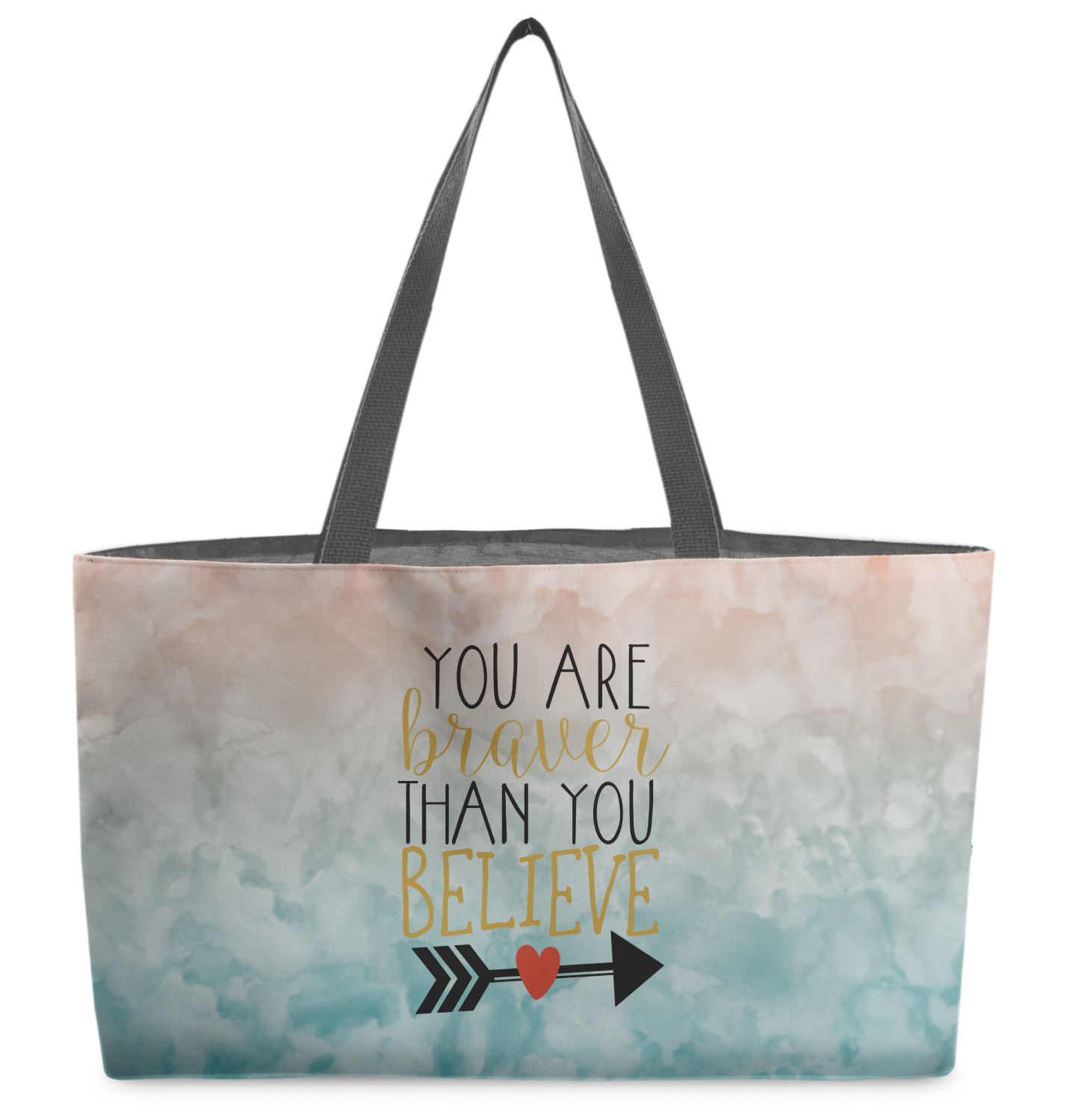 This design features one of our many inspirational quotes. This quote in particular reminds you that "you are braver than you believe." This uplifting quote has beatuiful and playful fonts to create it. An arrow sits below the quote to symbolize the bravery of the heart. The background is a lovely hombre watercolor pattern of teal/turquoise and peach. The calming colors make for a lovely inspirational design.