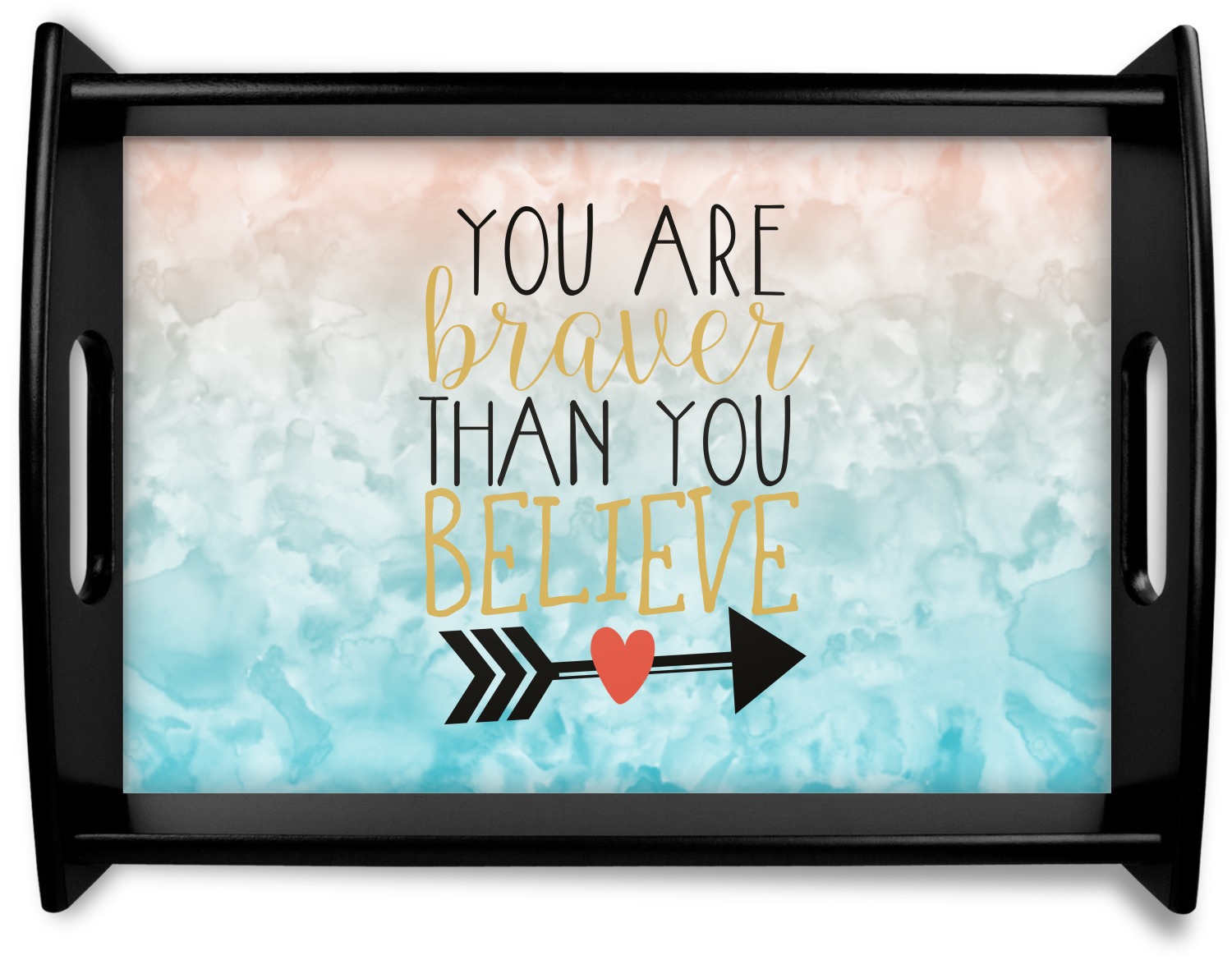 This design features one of our many inspirational quotes. This quote in particular reminds you that "you are braver than you believe." This uplifting quote has beatuiful and playful fonts to create it. An arrow sits below the quote to symbolize the bravery of the heart. The background is a lovely hombre watercolor pattern of teal/turquoise and peach. The calming colors make for a lovely inspirational design.