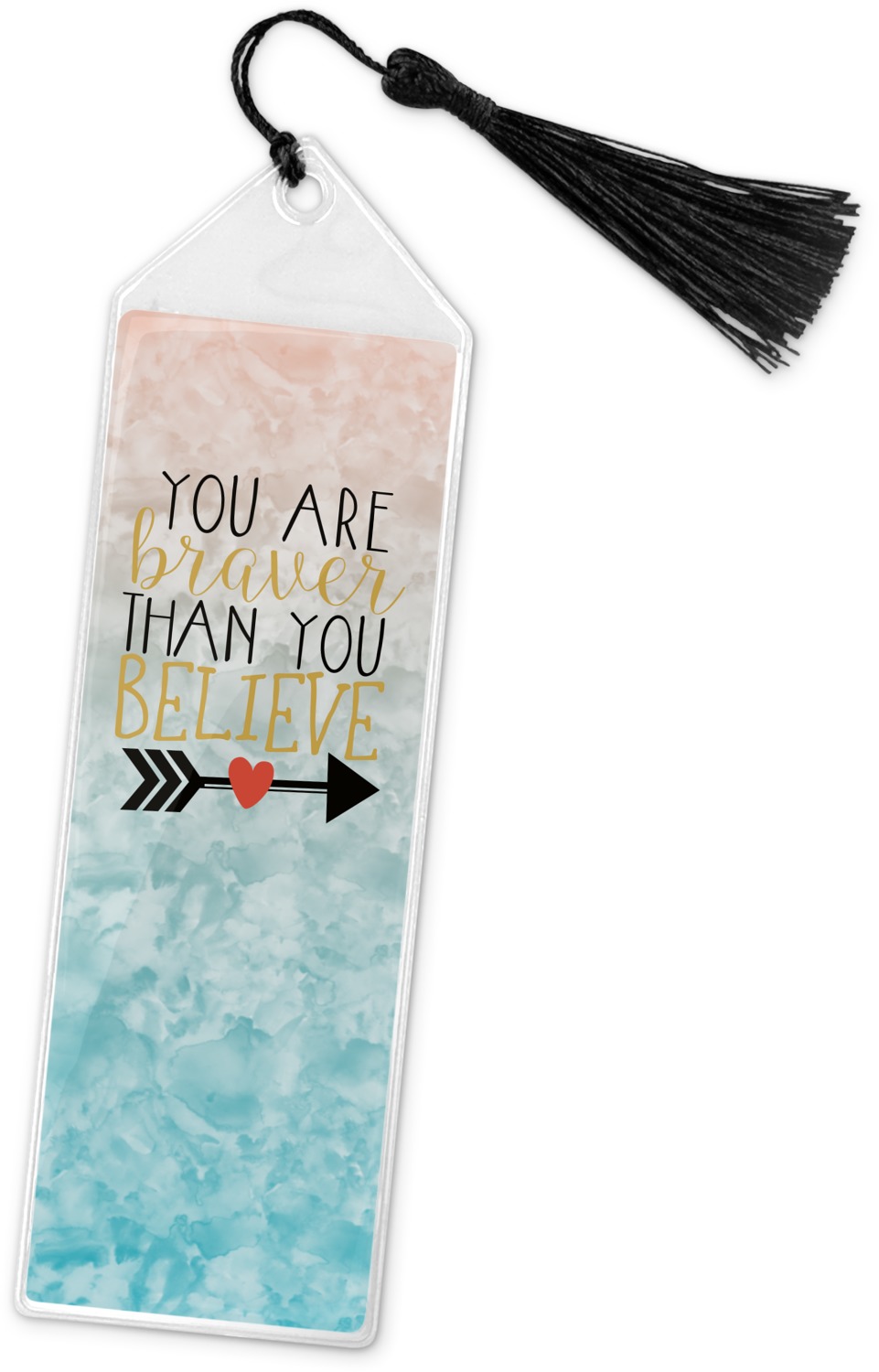 This design features one of our many inspirational quotes. This quote in particular reminds you that "you are braver than you believe." This uplifting quote has beatuiful and playful fonts to create it. An arrow sits below the quote to symbolize the bravery of the heart. The background is a lovely hombre watercolor pattern of teal/turquoise and peach. The calming colors make for a lovely inspirational design.