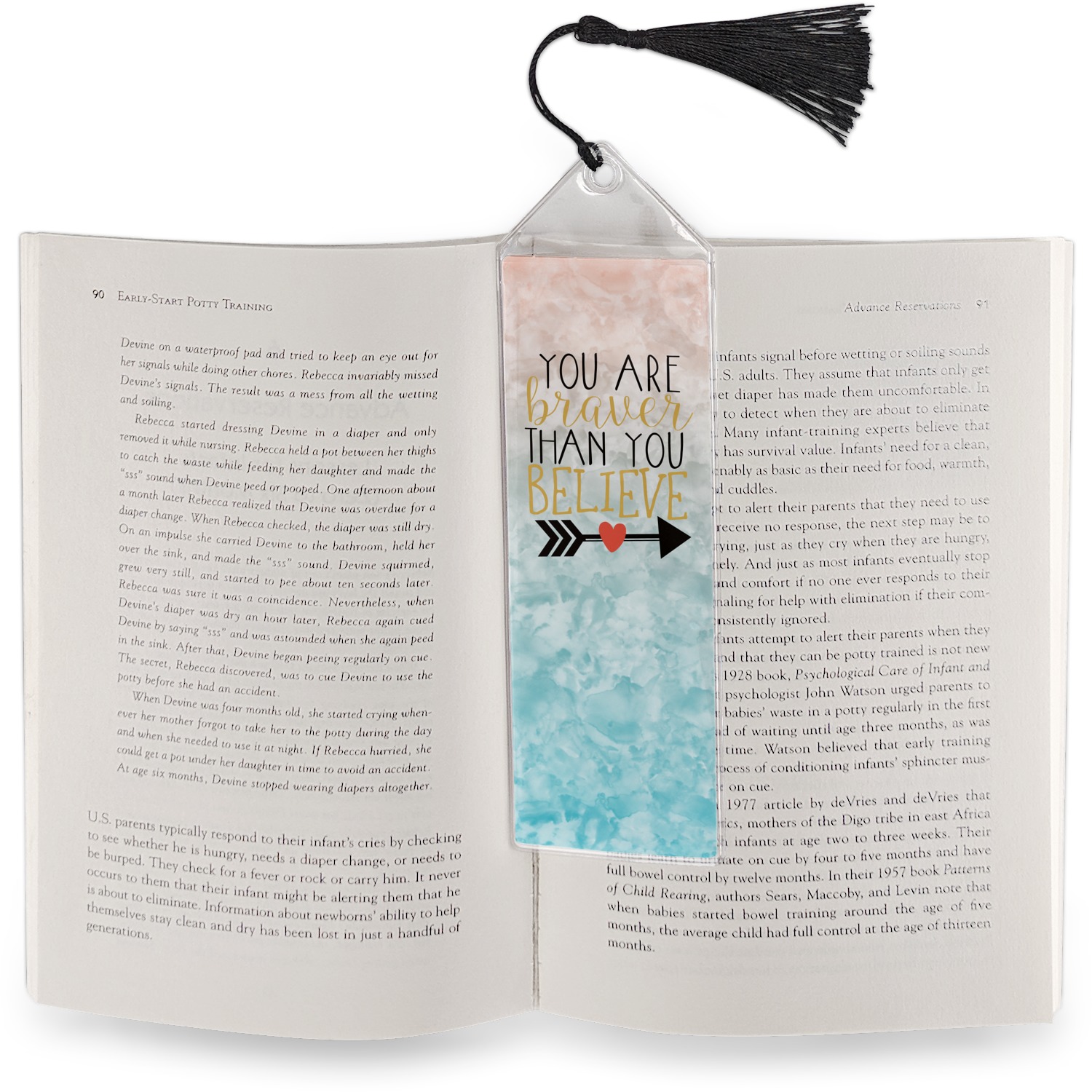Your personalized bookmark is made of a sturdy, clear vinyl, and is approximately 7.5" x 2.25". We display your personalization on vinyl inserts that are placed on both sides. Accompanying each book marker is a black, fringe tassel that attaches to the reinforced, triangular header.