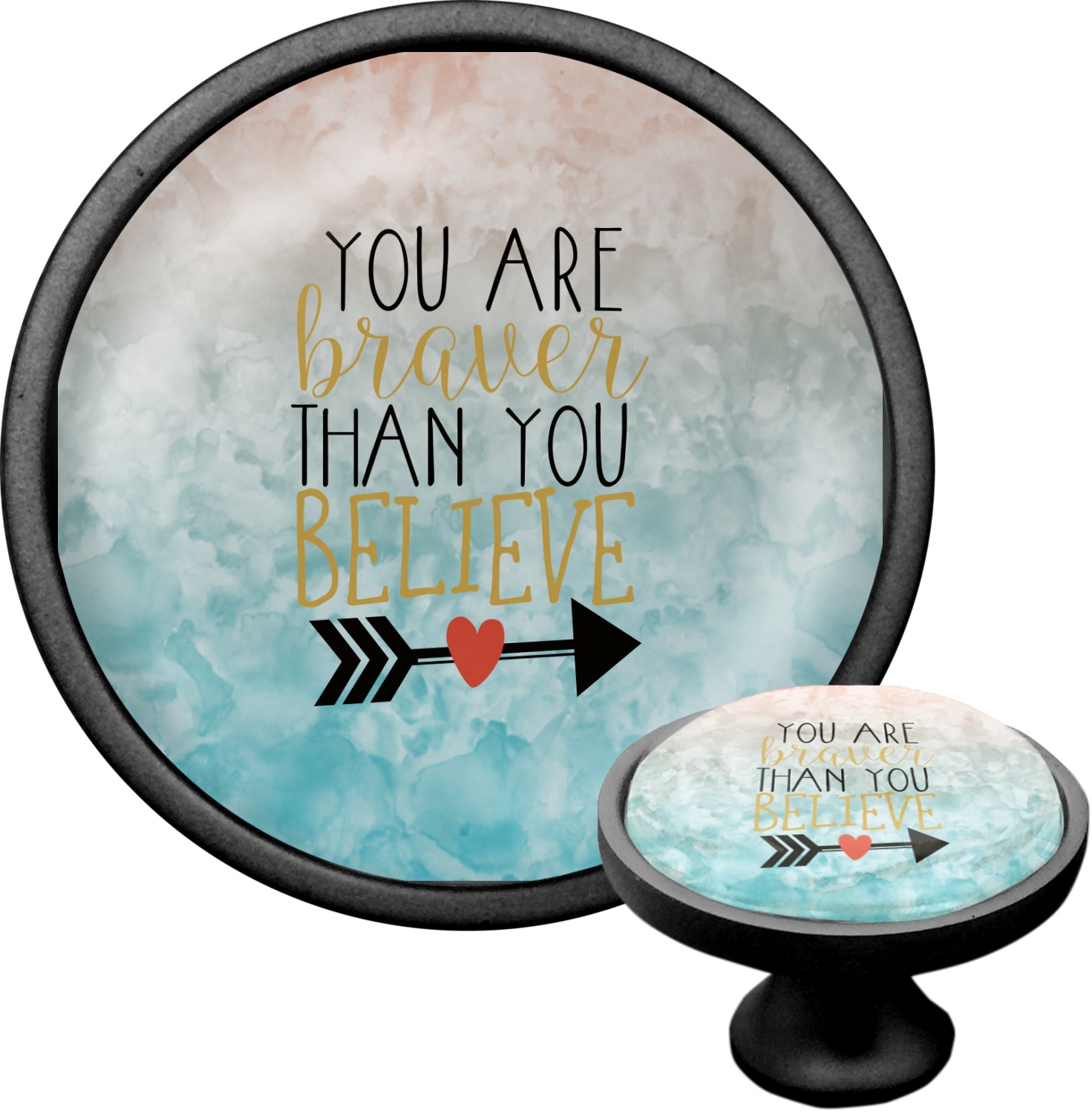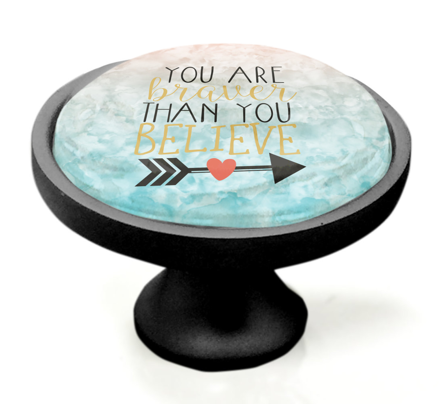 This design features one of our many inspirational quotes. This quote in particular reminds you that "you are braver than you believe." This uplifting quote has beatuiful and playful fonts to create it. An arrow sits below the quote to symbolize the bravery of the heart. The background is a lovely hombre watercolor pattern of teal/turquoise and peach. The calming colors make for a lovely inspirational design.
