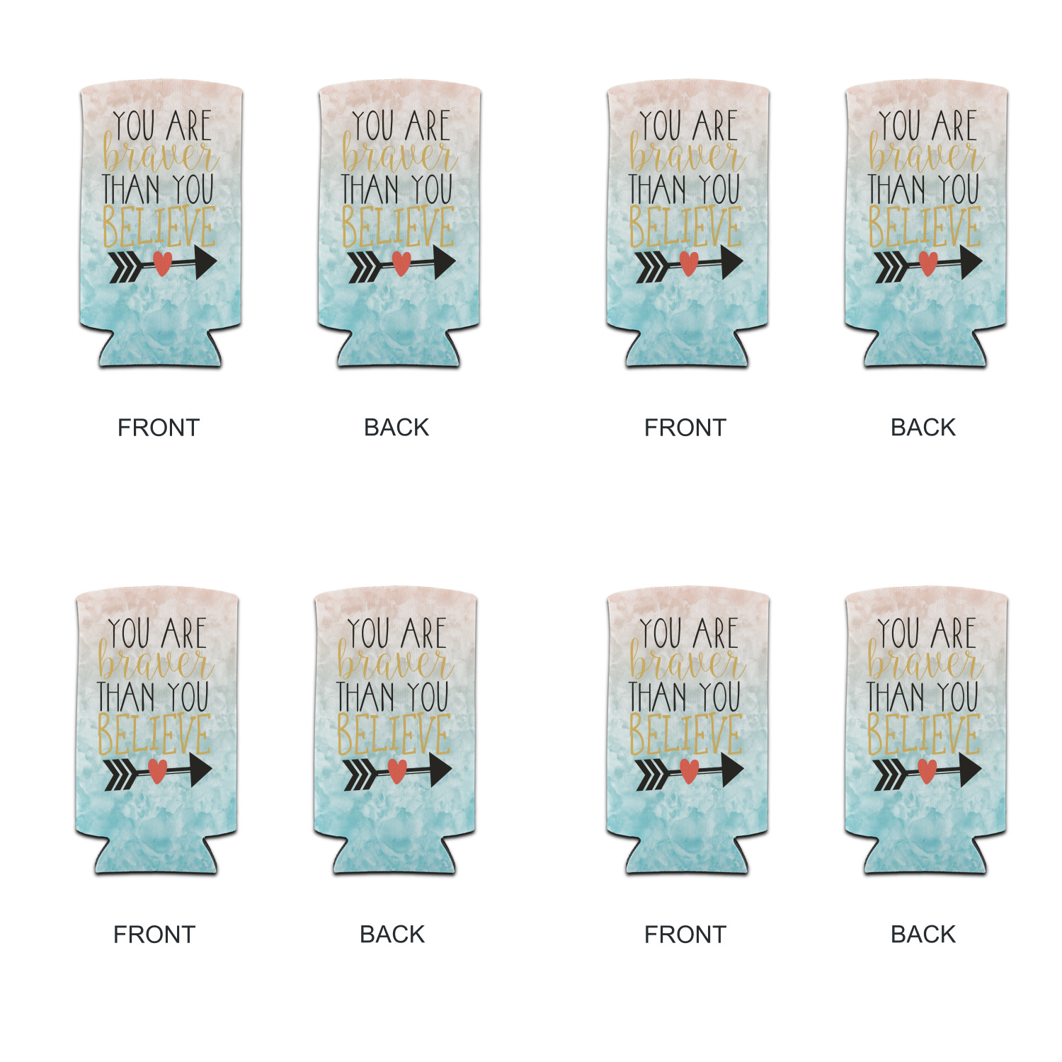 This design features one of our many inspirational quotes. This quote in particular reminds you that "you are braver than you believe." This uplifting quote has beatuiful and playful fonts to create it. An arrow sits below the quote to symbolize the bravery of the heart. The background is a lovely hombre watercolor pattern of teal/turquoise and peach. The calming colors make for a lovely inspirational design.