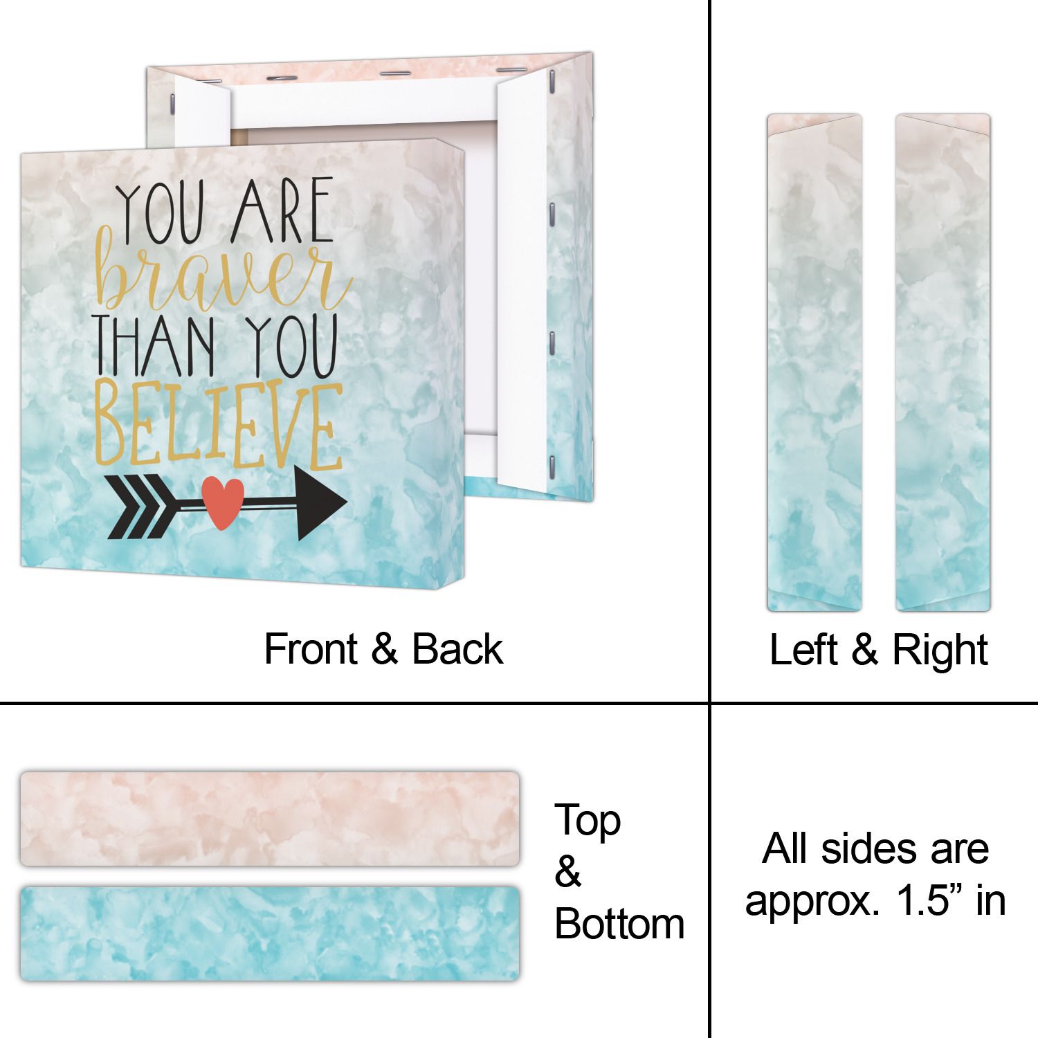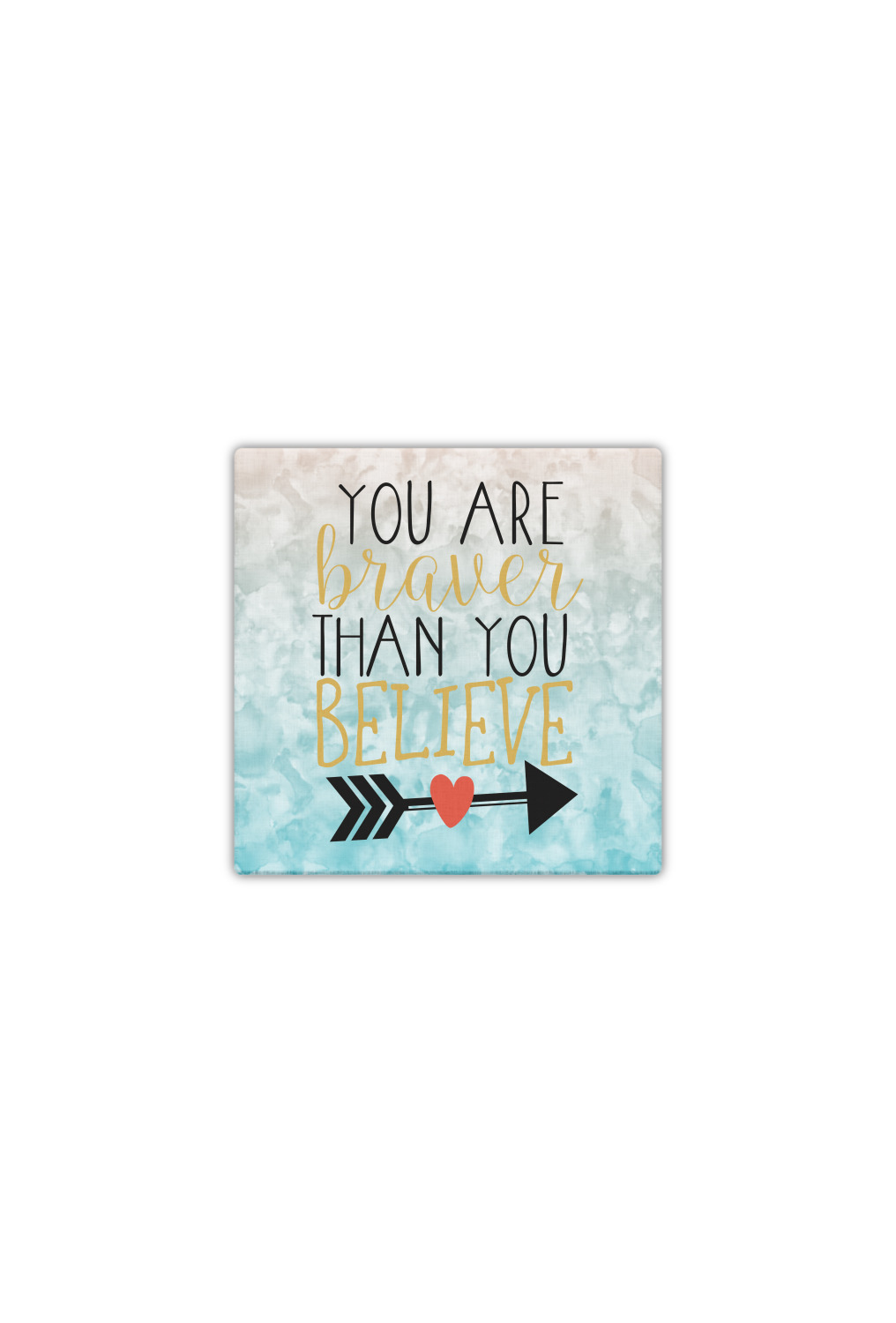 This design features one of our many inspirational quotes. This quote in particular reminds you that "you are braver than you believe." This uplifting quote has beatuiful and playful fonts to create it. An arrow sits below the quote to symbolize the bravery of the heart. The background is a lovely hombre watercolor pattern of teal/turquoise and peach. The calming colors make for a lovely inspirational design.
