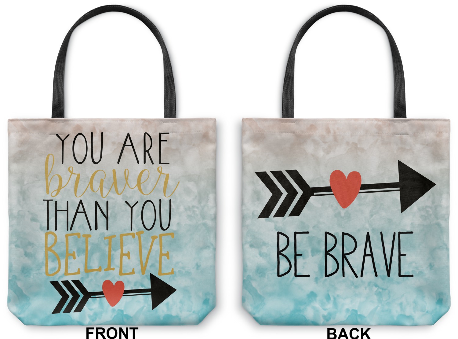 This design features one of our many inspirational quotes. This quote in particular reminds you that "you are braver than you believe." This uplifting quote has beatuiful and playful fonts to create it. An arrow sits below the quote to symbolize the bravery of the heart. The background is a lovely hombre watercolor pattern of teal/turquoise and peach. The calming colors make for a lovely inspirational design.