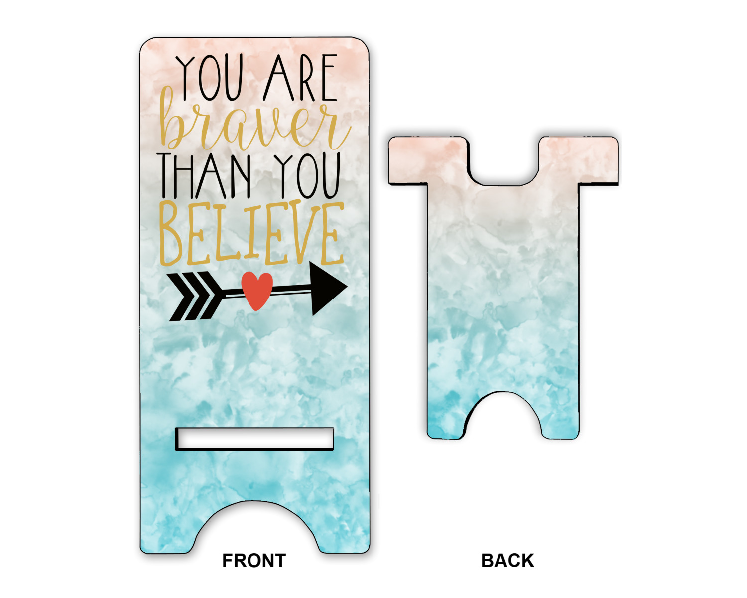 This design features one of our many inspirational quotes. This quote in particular reminds you that "you are braver than you believe." This uplifting quote has beatuiful and playful fonts to create it. An arrow sits below the quote to symbolize the bravery of the heart. The background is a lovely hombre watercolor pattern of teal/turquoise and peach. The calming colors make for a lovely inspirational design.