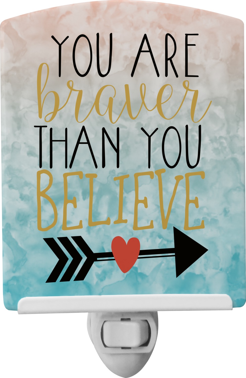 This design features one of our many inspirational quotes. This quote in particular reminds you that "you are braver than you believe." This uplifting quote has beatuiful and playful fonts to create it. An arrow sits below the quote to symbolize the bravery of the heart. The background is a lovely hombre watercolor pattern of teal/turquoise and peach. The calming colors make for a lovely inspirational design.