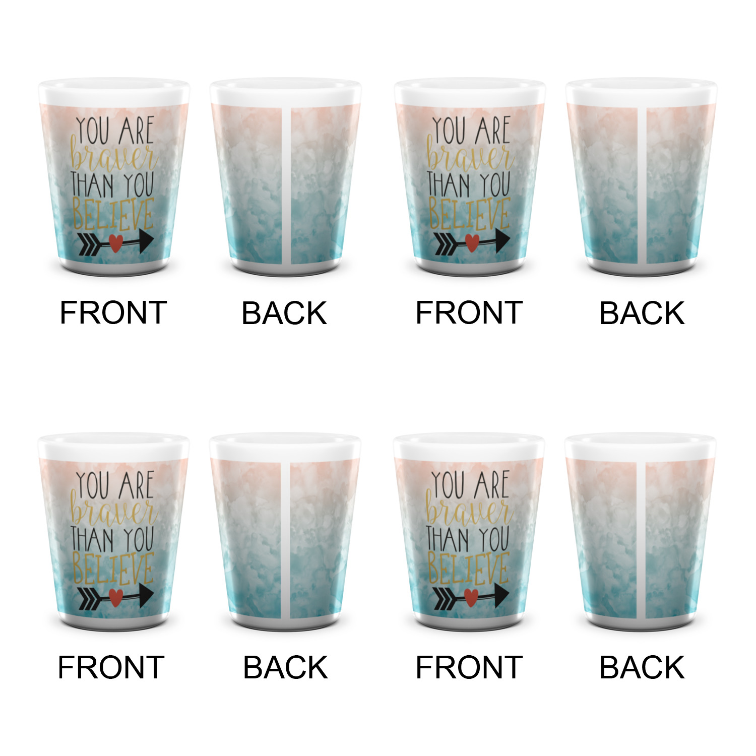 Made from ceramic these shot glasses are printed in full color with the design of your choice. These are a standard 1.5oz size and stand 2.25" tall. Available in a full white ceramic or a two-tone with a black color inside the shot glass. Buy a single or a set of 4, all of which can be designed separately to get you just what you want and need.