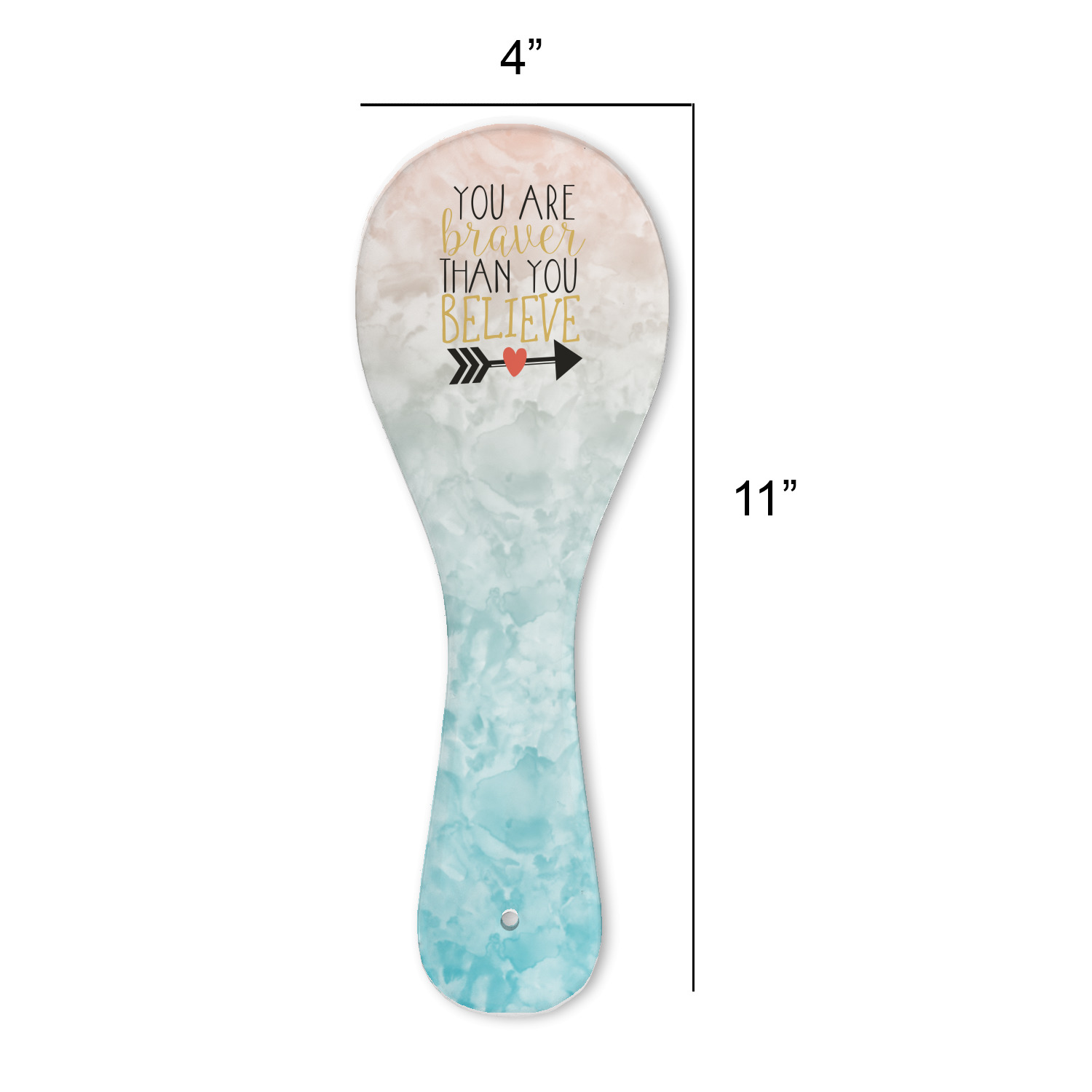 This design features one of our many inspirational quotes. This quote in particular reminds you that "you are braver than you believe." This uplifting quote has beatuiful and playful fonts to create it. An arrow sits below the quote to symbolize the bravery of the heart. The background is a lovely hombre watercolor pattern of teal/turquoise and peach. The calming colors make for a lovely inspirational design.